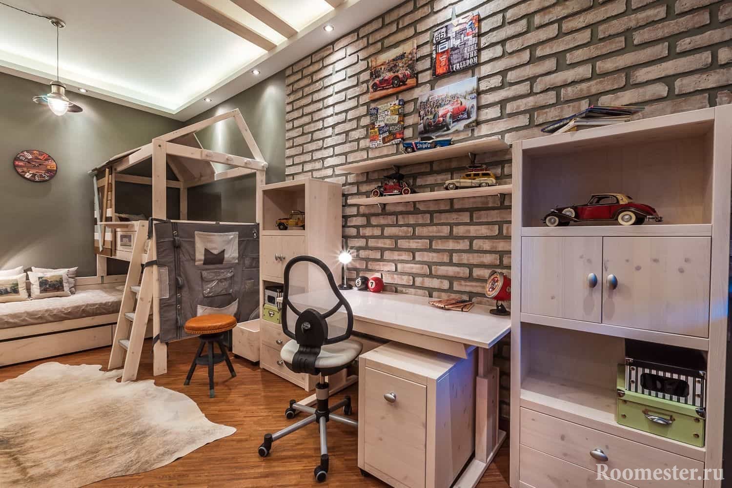 Un sucesor directo del estilo industrial, el loft es la opción más práctica para decorar una habitación infantil. Esto se debe a la falta de la necesidad de adherirse a un diseño único: se permite el uso de muebles de varios tamaños, accesorios inusuales e improvisación con el color de la decoración. Fidget chicos, este estilo te permite mostrar su naturaleza imprudente al máximo. Los padres solo pueden recordar un sentido de proporción, así como el hecho de que este diseño requerirá un gran espacio.