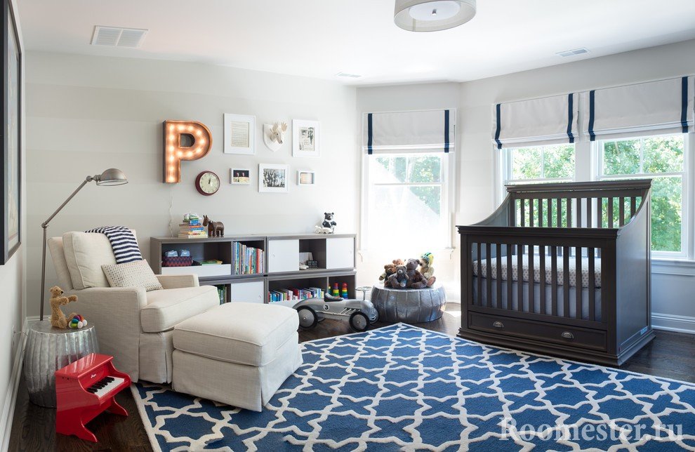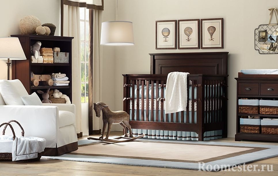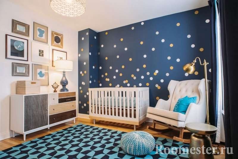 El diseño generalmente está dominado no solo por los colores de los hombres, sino también por varios atributos. Según los psicólogos, esto le permite educar adecuadamente al futuro hombre, habiendo desarrollado un fuerte carácter, asertividad y determinación. Los colores oscuros deben combinarse con elementos de acento brillantes o tonos claros.
