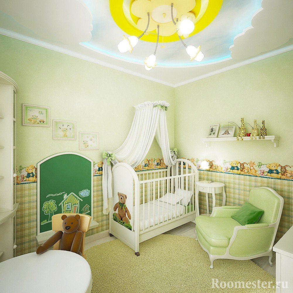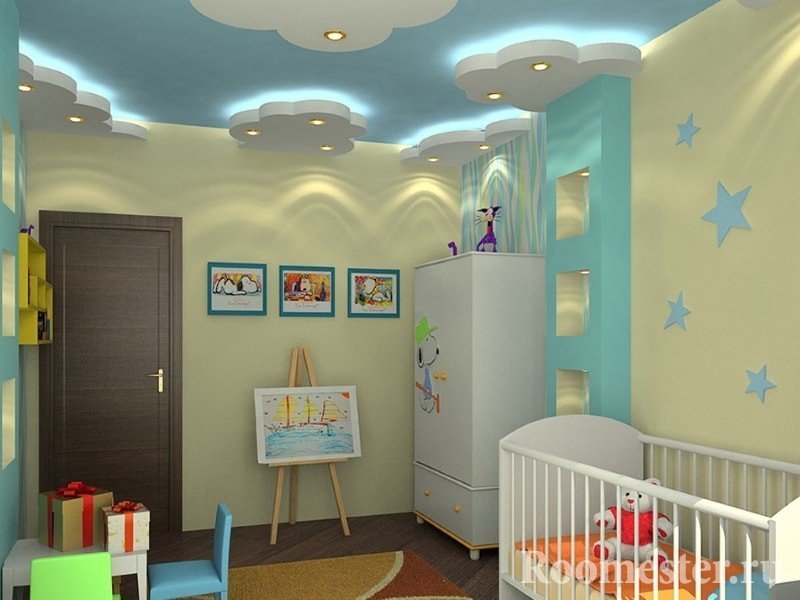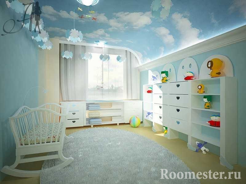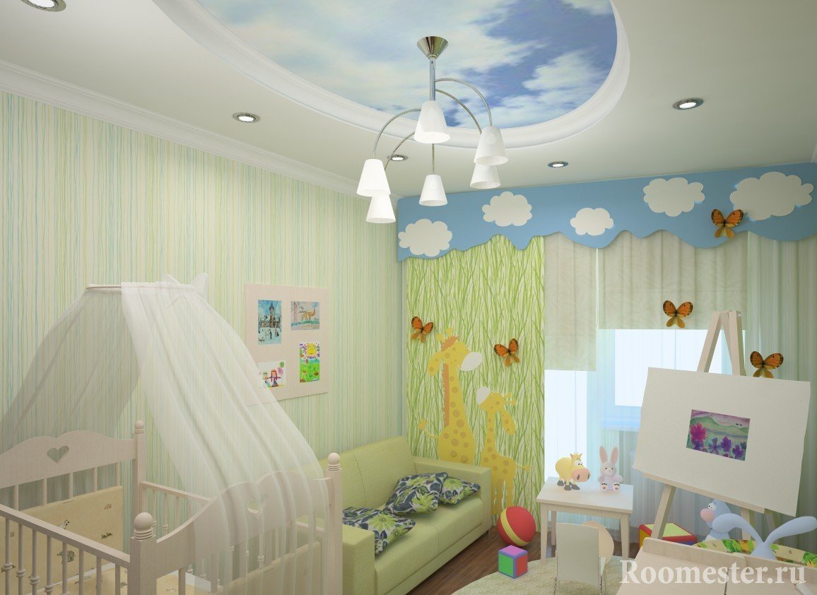 Hay muchas formas de colocar el techo en la habitación de un recién nacido. El techo se puede pegar con papel tapiz, pintar con pintura segura, decorar con molduras de estuco originales, configurar una estructura multinivel o de tensión. Los materiales para el diseño del techo deben cumplir los siguientes requisitos: