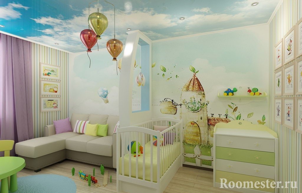 El bebé no puede declarar sus preferencias. Por lo tanto, el tema puede ser universal (la imagen del cielo, las nubes, las flores, las plantas, los animales) o el género (por ejemplo, automóviles para niños, hermosas princesas para niñas). Muy a menudo, el interior de una guardería para un recién nacido es la encarnación de las ideas de los padres sobre una guardería ideal y cómoda.
