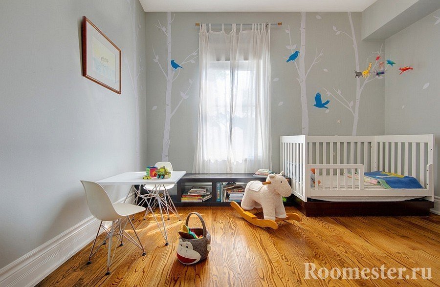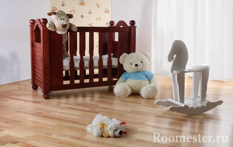 La mejor opción para organizar los pisos en el vivero es un tablero de madera natural con un revestimiento de laca estética. Esta opción es bastante costosa, pero los fabricantes garantizan la protección del medio ambiente del material natural. Una tabla de piso de madera se ve atractiva, perfectamente en armonía con cualquier dirección de estilo.