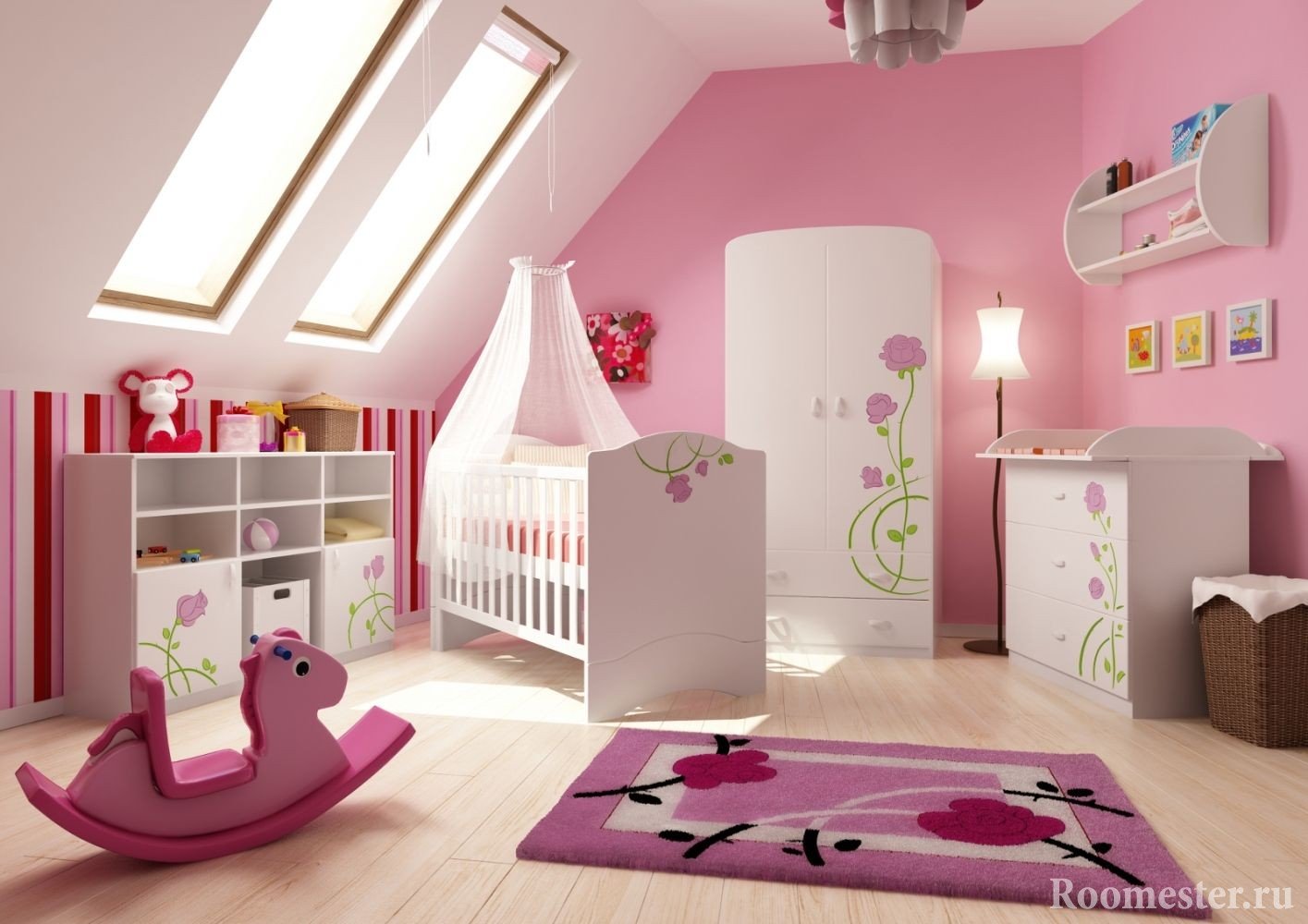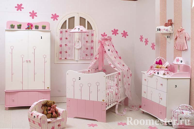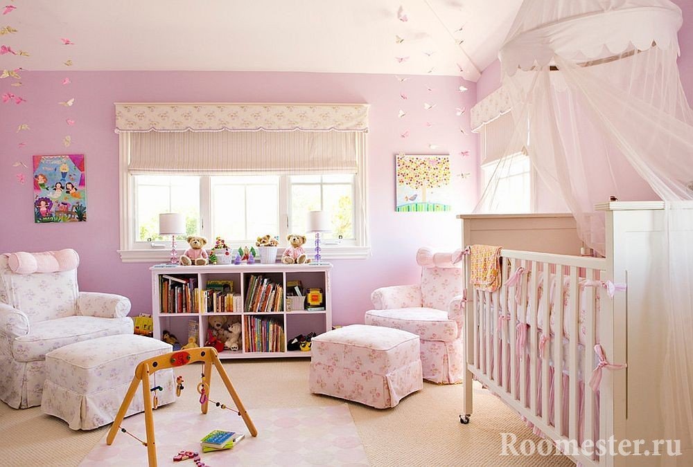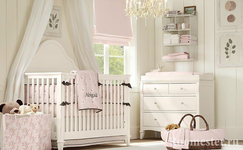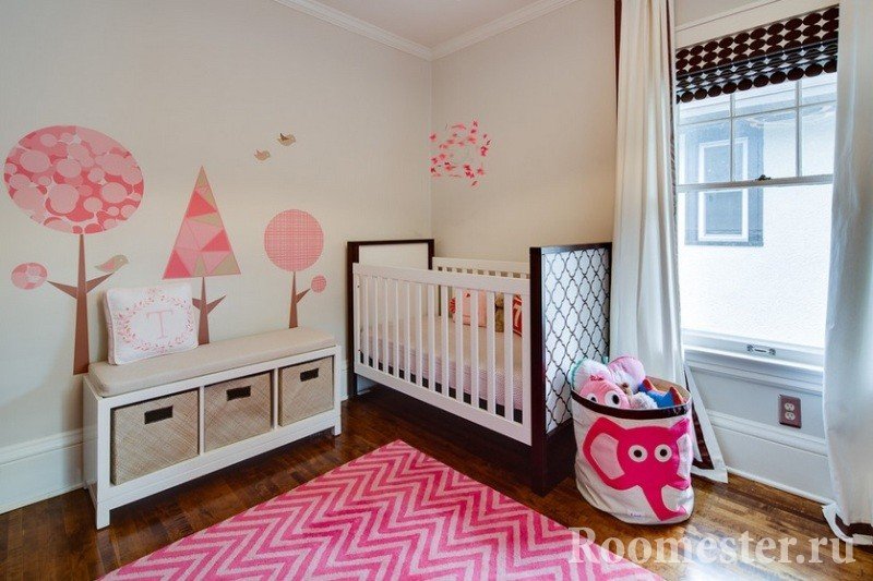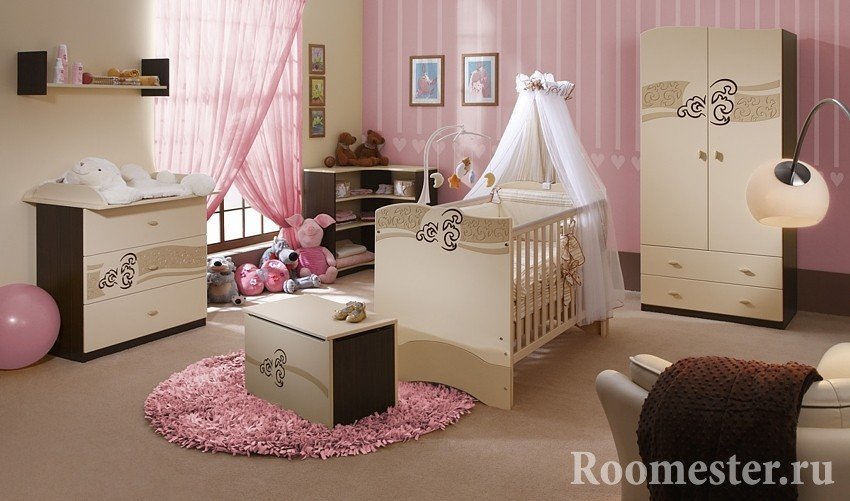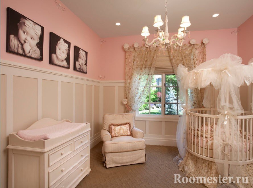 Al crear el diseño de la habitación para el bebé, los padres a menudo eligen diferentes tonos de rosa, a veces melocotón. Una gran opción es una combinación de rosa pálido y beige. En su contexto, el rosa se ve más rico y brillante. Si desea enfatizar la ternura del rosa, use textiles o muebles en colores chocolate.Con colores rosa brillante, turquesa y gris se mezclan perfectamente.