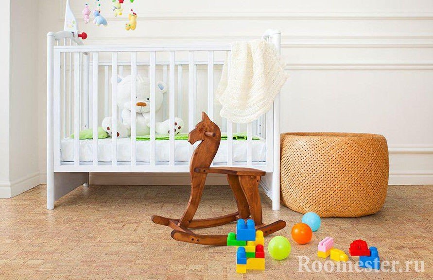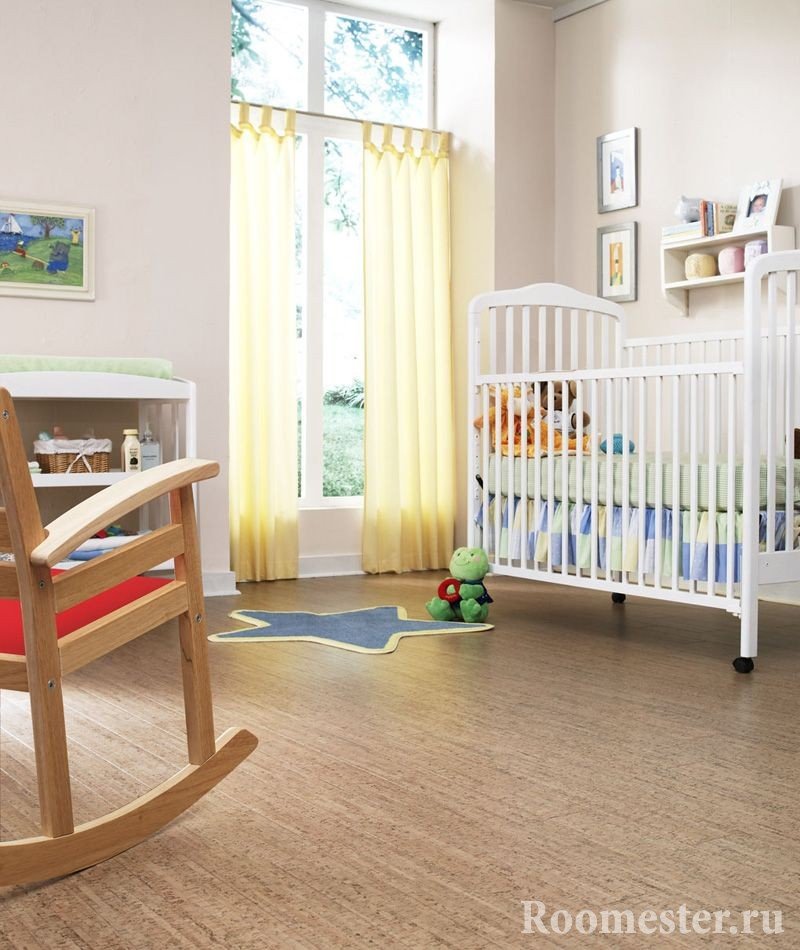 Para pisos en la habitación de los niños, los diseñadores recomiendan usar material de corcho. Tiene muchas ventajas: es agradable al tacto, es hipoalergénico, seguro, fácil de cuidar. Tenga en cuenta que la apariencia original del piso de corcho es adecuada para ciertos estilos de interiores.