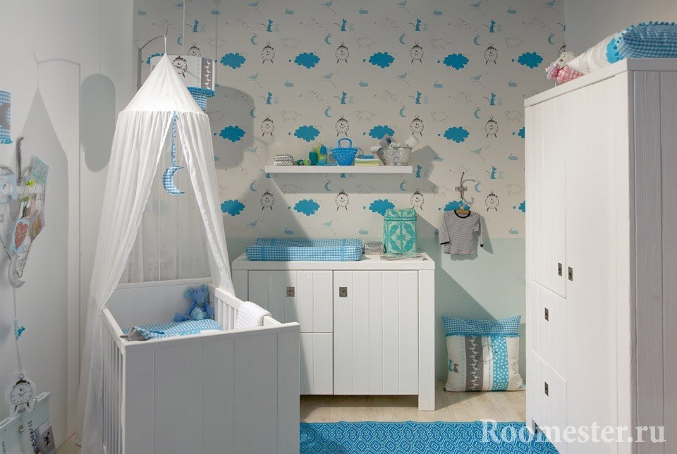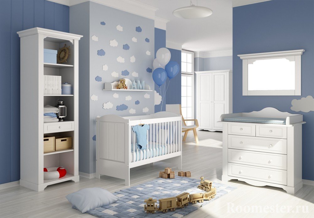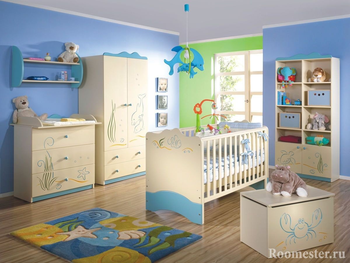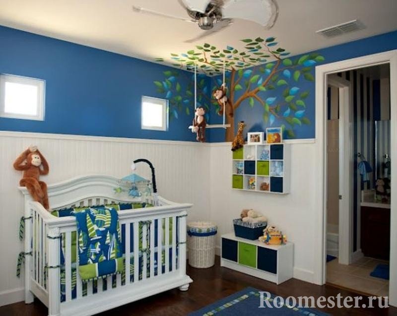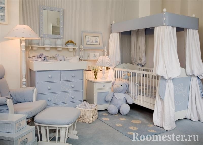 Existen estereotipos estándar sobre las preferencias de color de los niños de diferentes sexos. Los psicólogos dicen que el bebé es indiferente a las sombras. Por lo tanto, la decoración de la pared, la selección y la instalación de los muebles se realiza en los colores preferidos por los miembros adultos de la familia. Por lo general, los padres optan por materiales de calidad para la decoración de interiores y elementos interiores prácticos. Una habitación para un niño a menudo está decorada en azul o en colores más sobrios y masculinos: