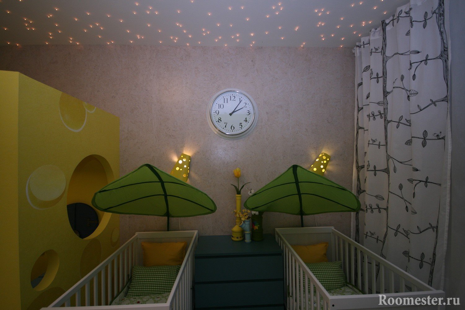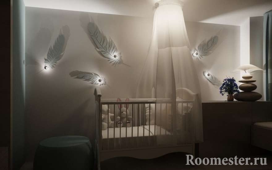 En los interiores infantiles para bebés, se debe prestar especial atención al problema urgente de la alimentación nocturna. En la vida de una madre y un bebé, esto juega un papel importante, por lo que se necesita una luz suave en la guardería, que no irritará los ojos del bebé y puede usarse como una lámpara de noche. Para la iluminación central, se pueden usar decoraciones para distraer al bebé.