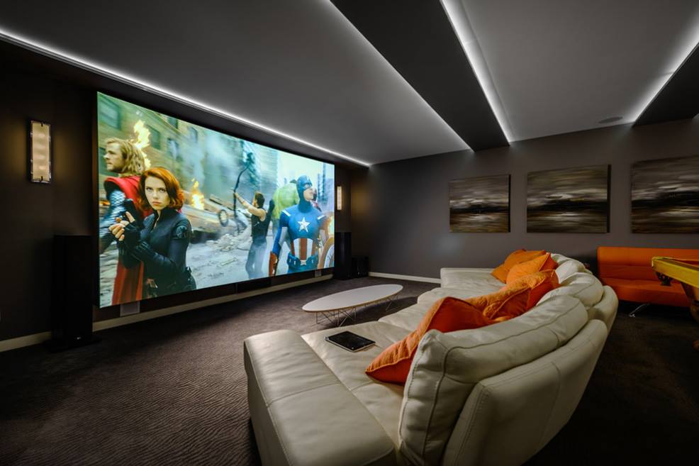 Un cine moderno, organizado en casa, se ve más eficazmente en un estilo que no está cargado de una gran cantidad de detalles. Ideal para estos fines:
