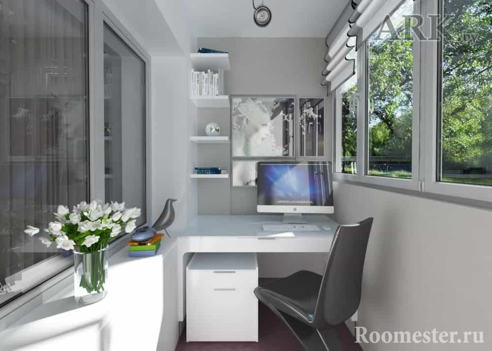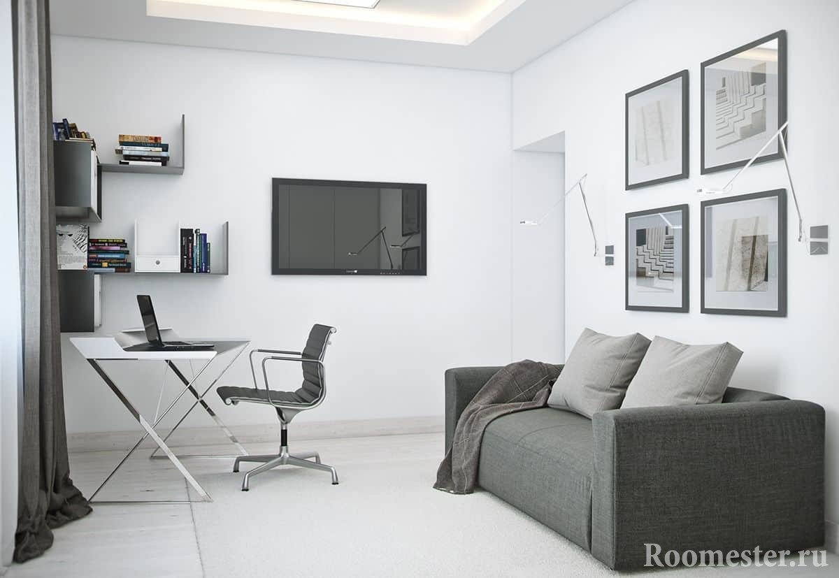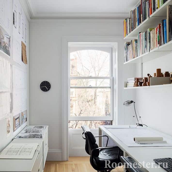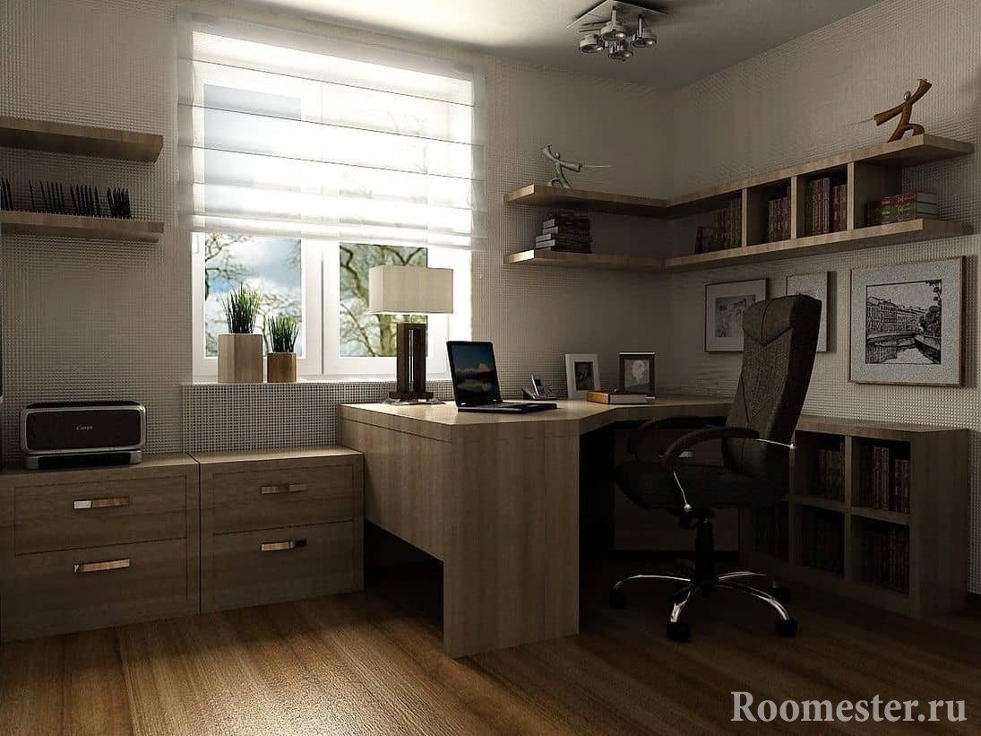 El mobiliario es un elemento esencial de la decoración de la habitación. El lugar de trabajo no puede estar lleno de una gran cantidad de estantes o gabinetes, ya que ese "diseño" especial afectará negativamente el trabajo.