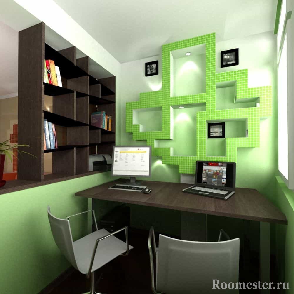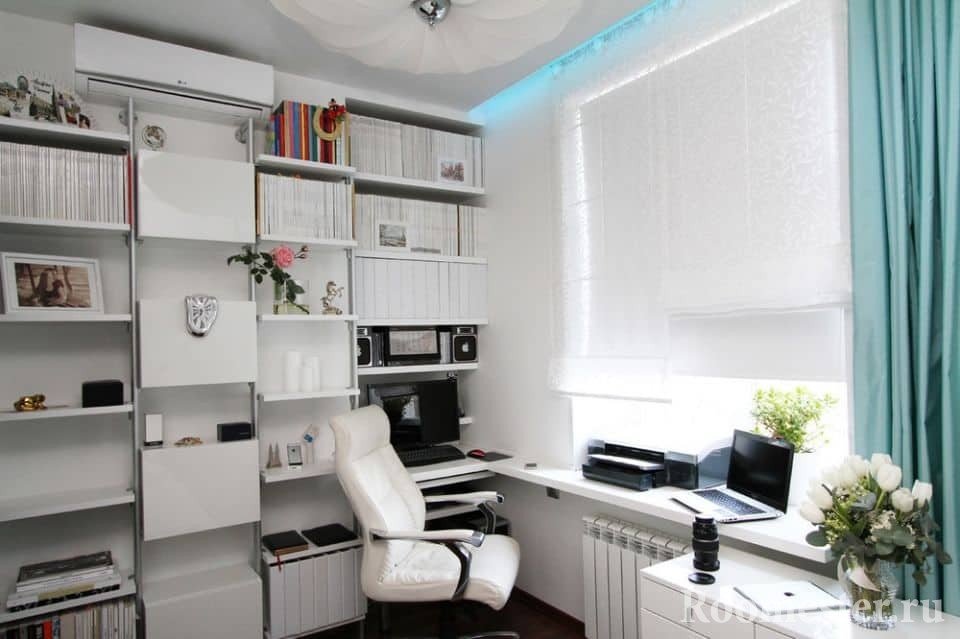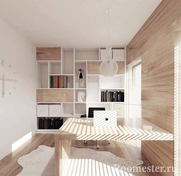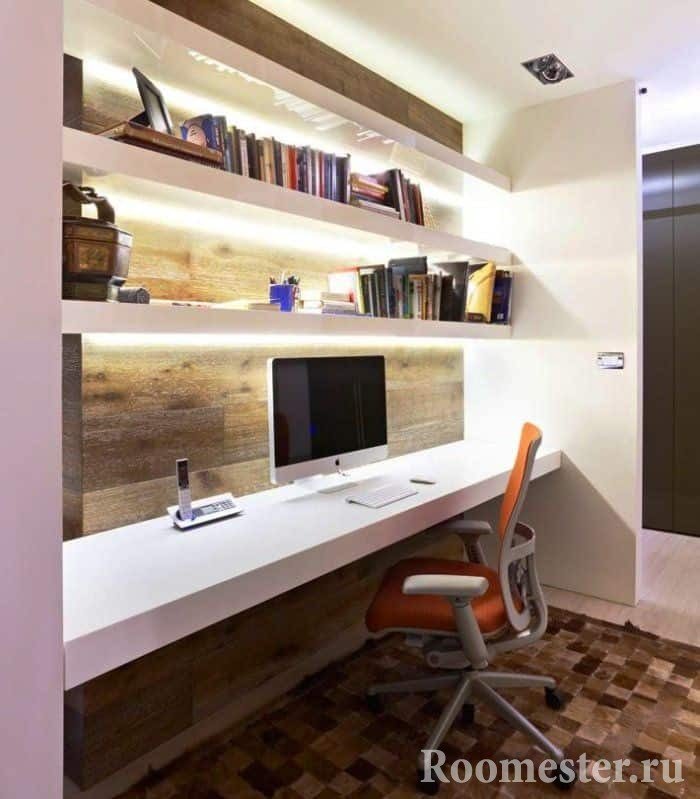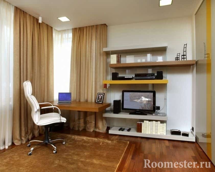 El diseño de una oficina moderna en un apartamento con una pequeña cuadratura se puede formar con el apoyo de los colores claros de las paredes y la luz cálida. Para que pueda crear la impresión de un gran espacio libre.
