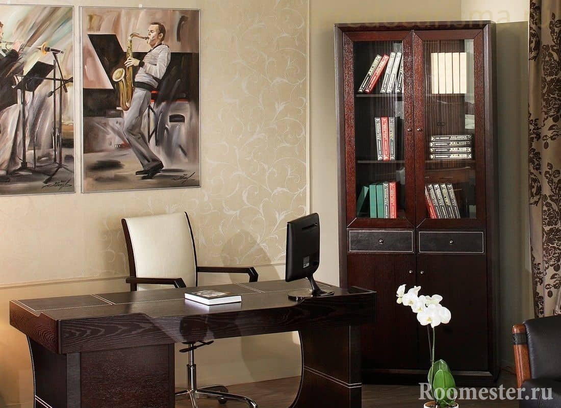 Grandes clásicos, minimalismo de alta tecnología, un estilo glamoroso o un estudio creativo: hay una gran cantidad de opciones, sin embargo, la vista general de la sala de trabajo debe ser elegante, gratuita y también crear un ambiente de trabajo. Por ejemplo, la pared de color marrón rojizo, a menudo utilizada en el diseño de gabinetes, forma instantáneamente la atmósfera de un fuerte bungalow de soltero, una seductora ilusión de independencia.