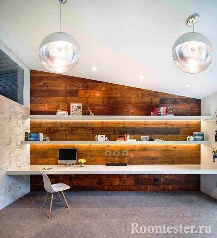 El tamaño de la habitación. La iluminación artificial debe cumplir completamente con la cuadratura de la habitación donde se encuentra la oficina en el hogar, iluminando uniformemente no solo el área de trabajo, sino también el espacio alrededor.