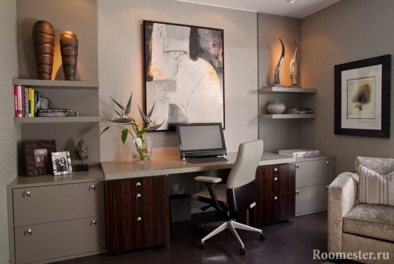 En el escritorio, es suficiente colocar una PC, teléfono móvil, agenda, instrumentos de escritura. Este tipo de entorno dirigirá los pensamientos en la dirección correcta, afectando directamente la efectividad de sus actividades. Las pinturas artísticas son bienvenidas, sin embargo, en pequeñas cantidades. Tienen un poderoso efecto en todos los que están en la oficina. Los paisajes marinos y los lienzos de color restringido crearán el ambiente para el trabajo, aumentarán el potencial de las fuerzas, pero la imagen de flores y bodegones traerá paz, reduciendo el nivel de rendimiento. Por lo tanto, los bodegones son más adecuados para lugares de descanso.