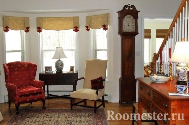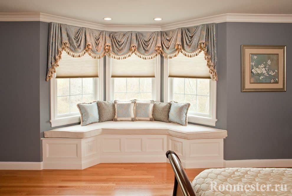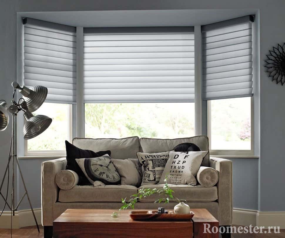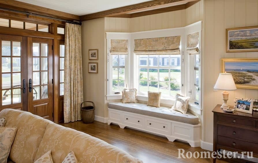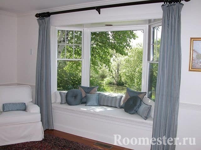La ventana salediza en el interior es principalmente la ubicación de aberturas de ventana adicionales, será necesario levantarla sobre la base de esto. En algunos casos, para la decoración, puede usar cortinas colocadas en una repisa especial que repetirá los contornos de las paredes. Debe elegir telas ligeras que transmitan bien la luz. También puede usar persianas o persianas enrollables.