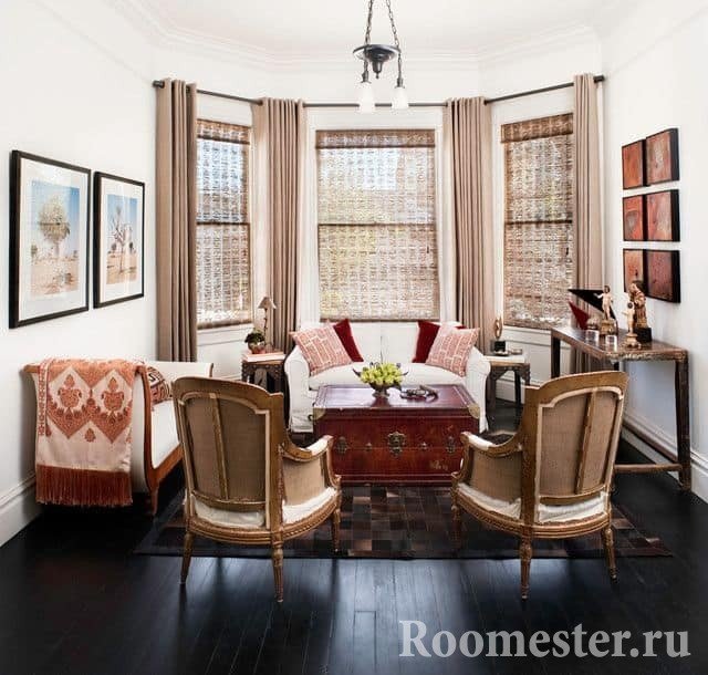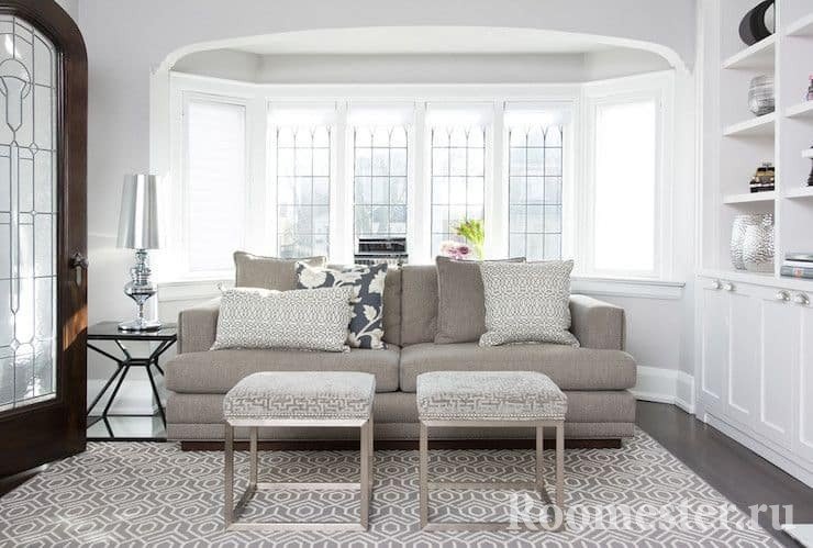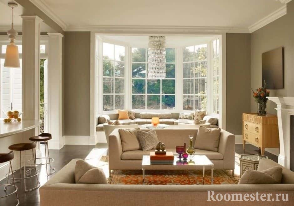 Dado que el ventanal es una parte sobresaliente del edificio, es necesario suavizar la transición entre este y la parte principal de la habitación. Muchos expertos recomiendan usar papel tapiz sin una imagen para decorar la sala de estar. Puedes pintar las paredes en un color liso. La monotonía se compensa con la adición de varios detalles: figuras, relojes, pinturas y fotografías. Es importante no exagerar con elementos adicionales. Su exceso puede crear la impresión de caos y mal gusto.