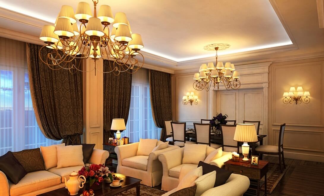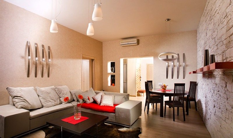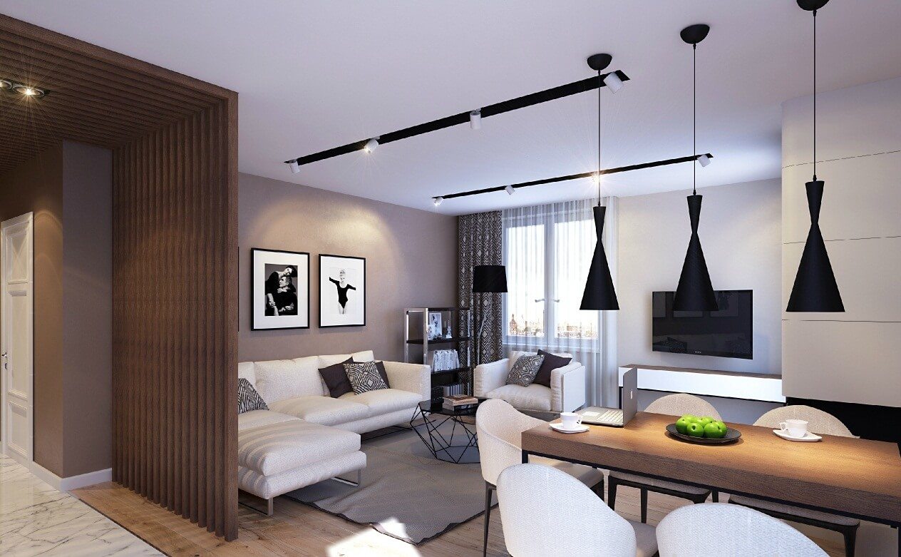 Antes de combinar las dos habitaciones, vale la pena considerar de antemano el diseño de las fuentes de luz. Es posible que tenga que estirar el cableado adicional, por lo que debe resolver el problema en la etapa del proyecto antes de terminar. La combinación obligará a los propietarios a preocuparse por la cobertura "doble", porque ahora hay dos zonas funcionales. Incluso una lámpara de techo ya no puede hacer frente. Se recomienda que se instale un grupo de dispositivos de iluminación sobre el área del comedor, que colgará por debajo de la mesa. Si es necesario, su altura se puede ajustar. Por lo tanto, creará una sensación de aislamiento entre los comensales del resto de la sala. La práctica de zonificación por fuentes puntuales de luz también se usa activamente. En salas de estar pequeñas, que son peligrosas de combinar (generalmente en condiciones de hacinamiento, pero no en insulto, no funciona aquí), la abundancia de luz artificial salvará el desorden. Se reflejará muchas veces en superficies de vidrio y espejo.