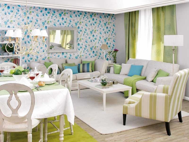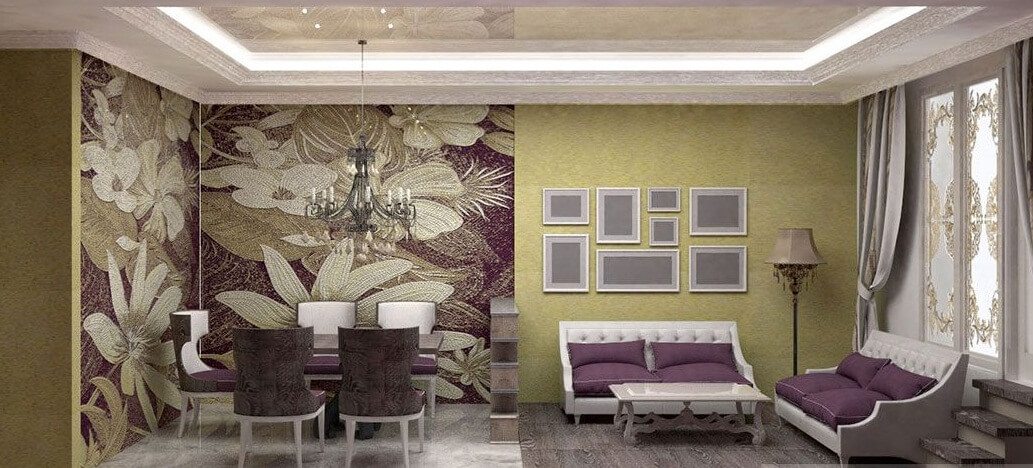 Comienzan a trabajar desde el techo, luego van a las paredes y completan el proceso con un piso. La sala de estar no está clasificada como una habitación con un microclima difícil. Incluso si se combina con el comedor, no se producirán cambios significativos en el "estado" de la sala. Una situación completamente diferente es con el trío (cocina, comedor, sala de estar).Como casi se acercaron a los estudios, prestan especial atención a los materiales que sobrevivirán a la cocción constante, el vapor, los trozos de grasa, los olores picantes, las altas temperaturas y otros "encantos" del entorno de la cocina. Es importante saberlo. La fase preparatoria generalmente incluye una masilla para suavizar defectos, una imprimación para asegurar una buena adhesión del material y adhesivo a la superficie y, si es necesario, la construcción de estructuras de marco.