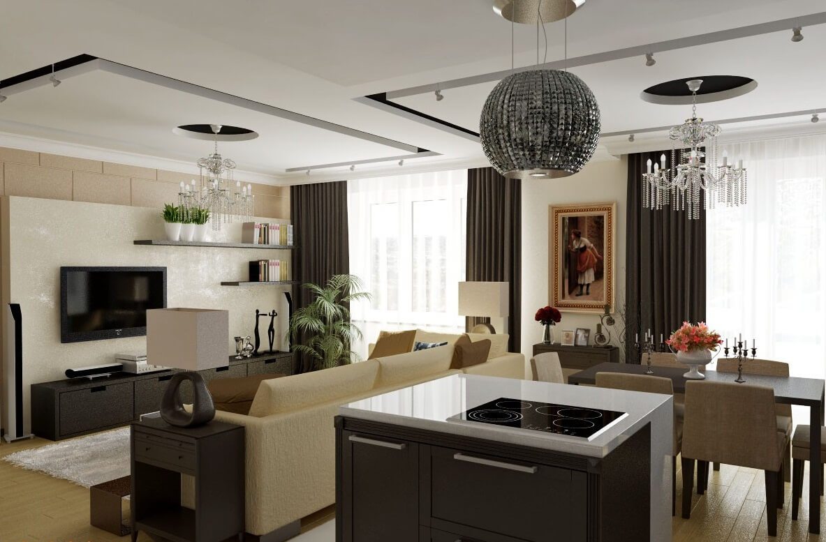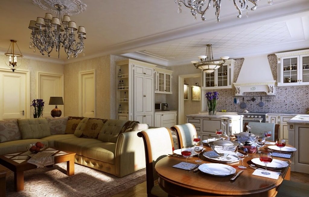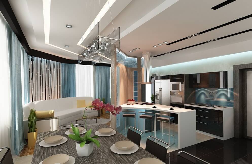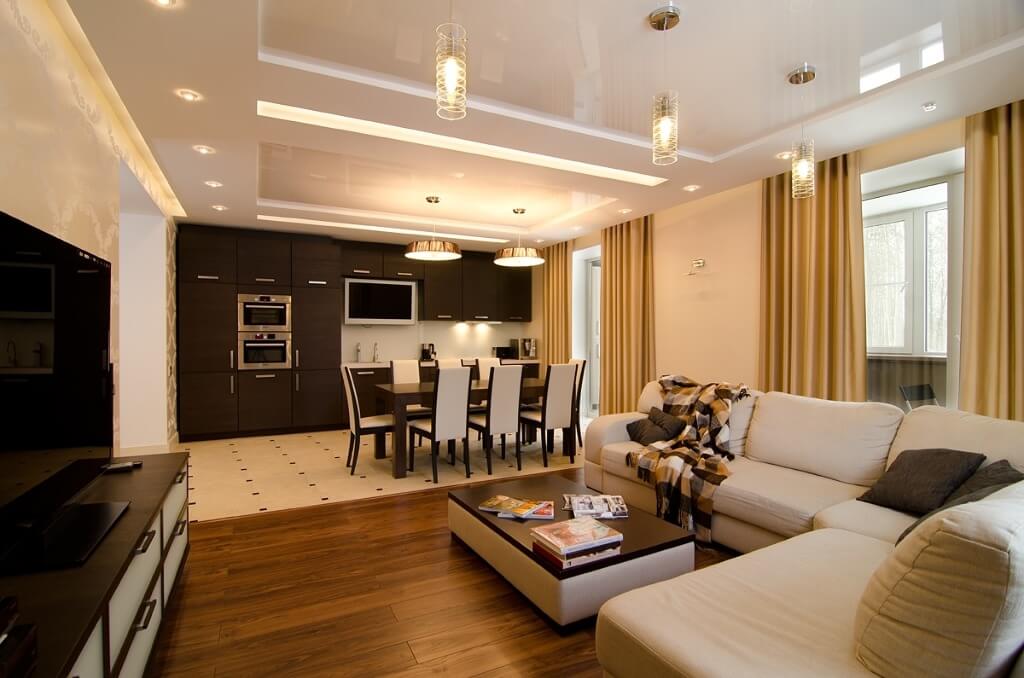 Comienzan a trabajar desde el techo, luego van a las paredes y completan el proceso con un piso. La sala de estar no está clasificada como una habitación con un microclima difícil. Incluso si se combina con el comedor, no se producirán cambios significativos en el "estado" de la sala. Una situación completamente diferente es con el trío (cocina, comedor, sala de estar).Como casi se acercaron a los estudios, prestan especial atención a los materiales que sobrevivirán a la cocción constante, el vapor, los trozos de grasa, los olores picantes, las altas temperaturas y otros "encantos" del entorno de la cocina.