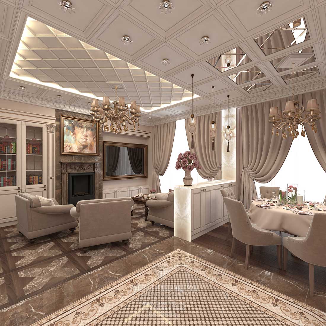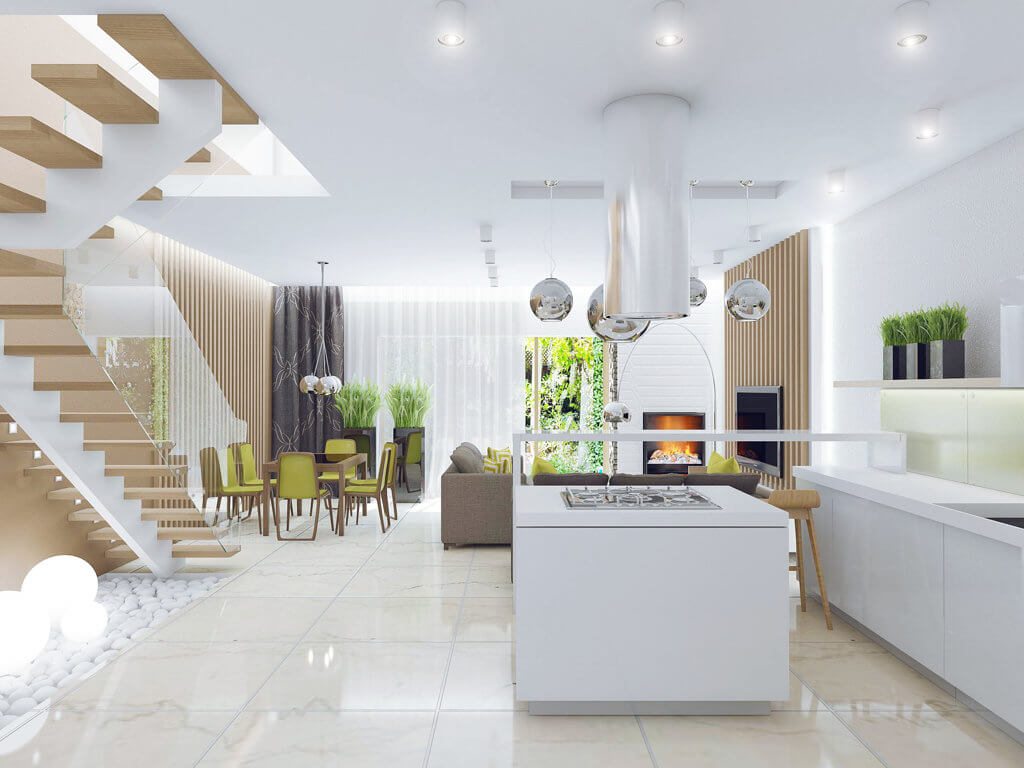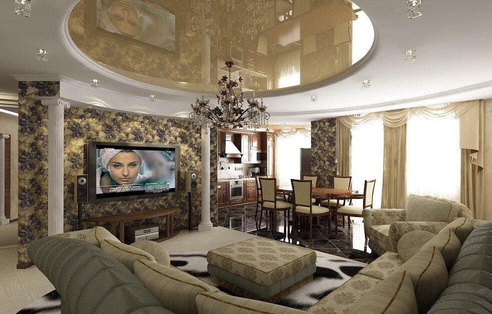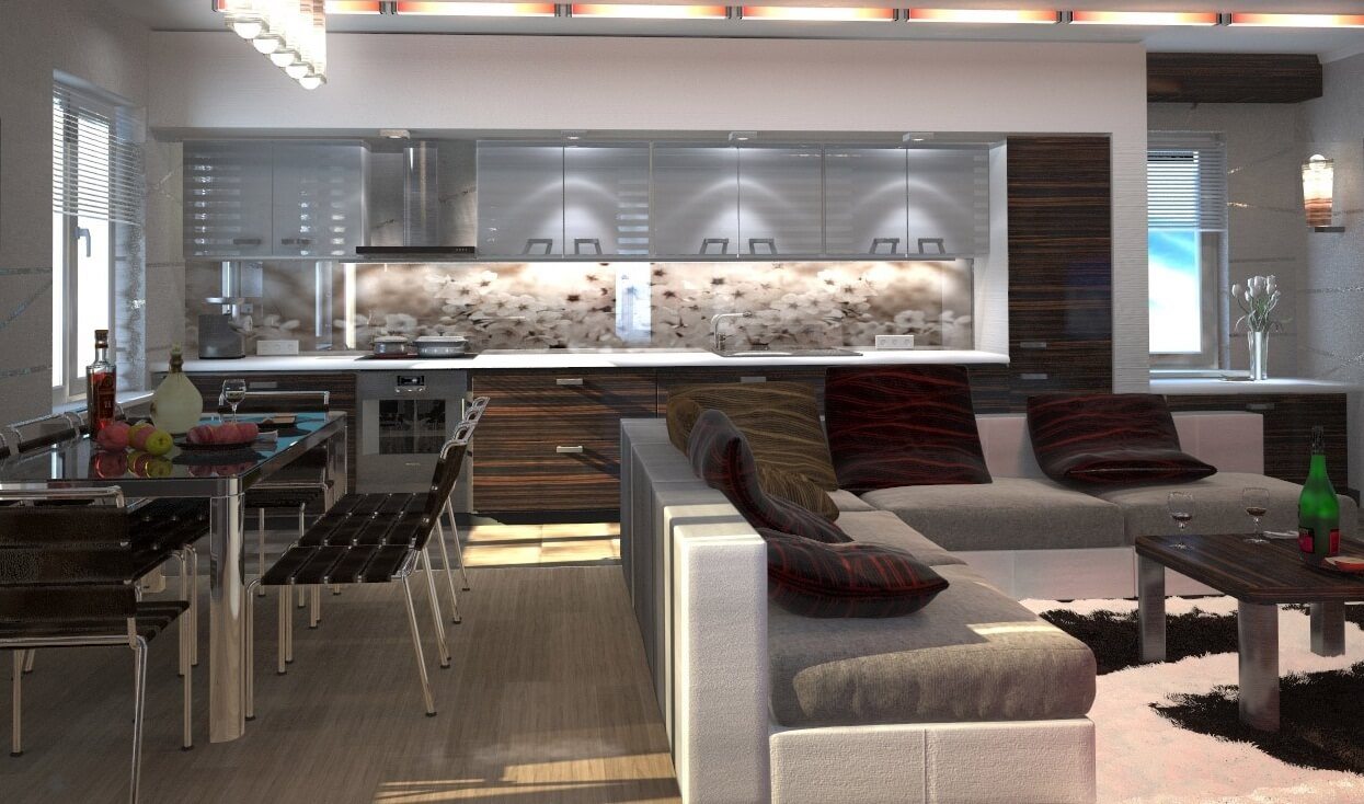 Comienzan a trabajar desde el techo, luego van a las paredes y completan el proceso con un piso. La sala de estar no está clasificada como una habitación con un microclima difícil. Incluso si se combina con el comedor, no se producirán cambios significativos en el "estado" de la sala. Una situación completamente diferente es con el trío (cocina, comedor, sala de estar).Como casi se acercaron a los estudios, prestan especial atención a los materiales que sobrevivirán a la cocción constante, el vapor, los trozos de grasa, los olores picantes, las altas temperaturas y otros "encantos" del entorno de la cocina.