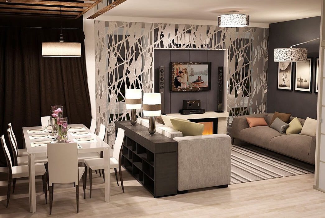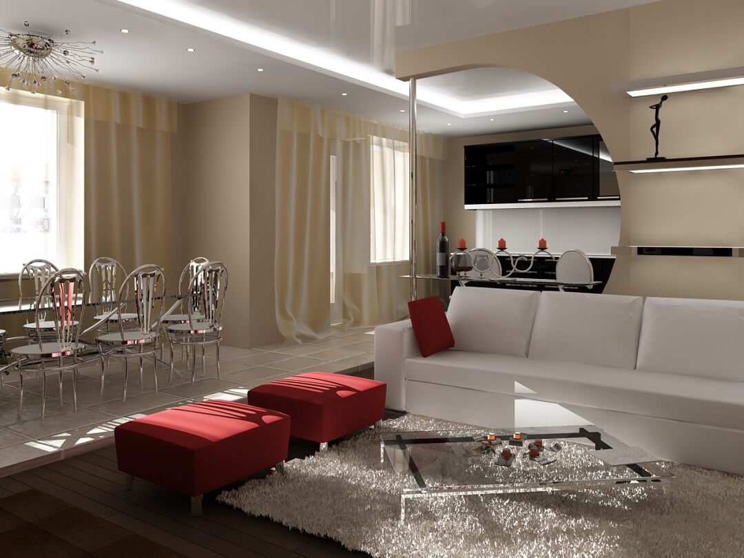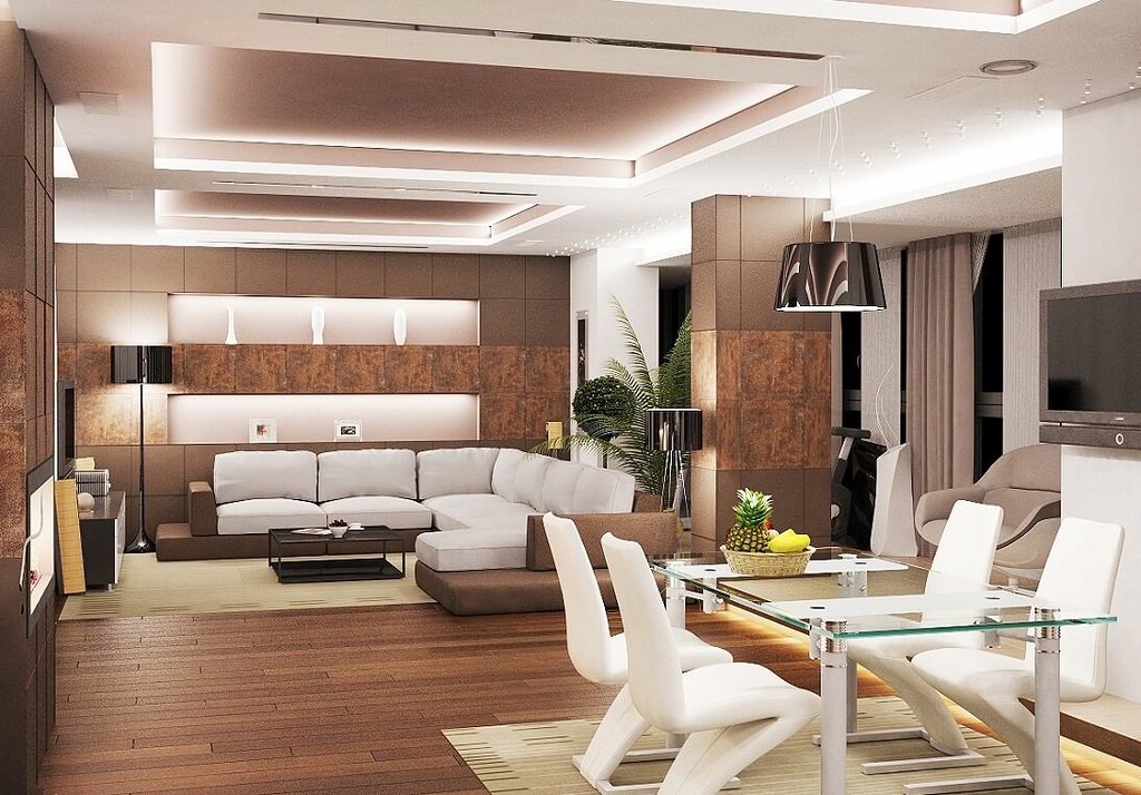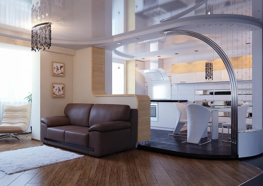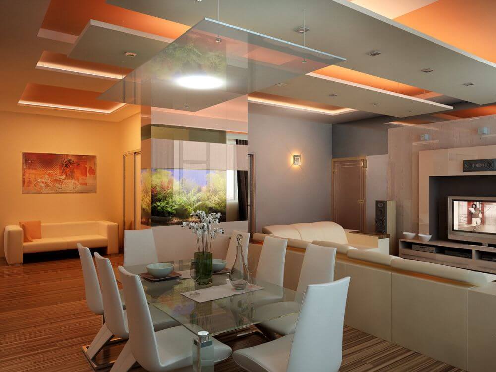 La selección de un área de comedor y un área de recreación en dicha habitación se realiza con objetos, muebles, muebles e iluminación, con colores. En la zonificación, puede usar varios acabados y materiales para revestimientos de pisos y paredes. El lugar para comer debe diferir del área de descanso en color o sombra. La diferenciación de los muebles se lleva a cabo mediante la disposición de sillas, sofás, estanterías. La zonificación más fácil se realiza utilizando un gran arco. Con esta decisión, se proporciona luz y espacio visual de la sala. Una solución inusual y original es dividir el espacio con diferentes niveles de pisos o techos. Deben proporcionarse fuentes de iluminación para niveles múltiples y locales, de modo que no "capturen" otras áreas. En cada área funcional separada, se cuelga una lámpara de techo. El tipo y la forma de la lámpara se seleccionan en función de la altura de los techos. La hermosa retroiluminación LED local en el nivel más bajo ayudará a resaltar efectivamente un lugar de descanso. Cuando se utiliza la zonificación con pisos y techos de varios niveles, las fuentes de iluminación interna se integran orgánicamente en el escalón.