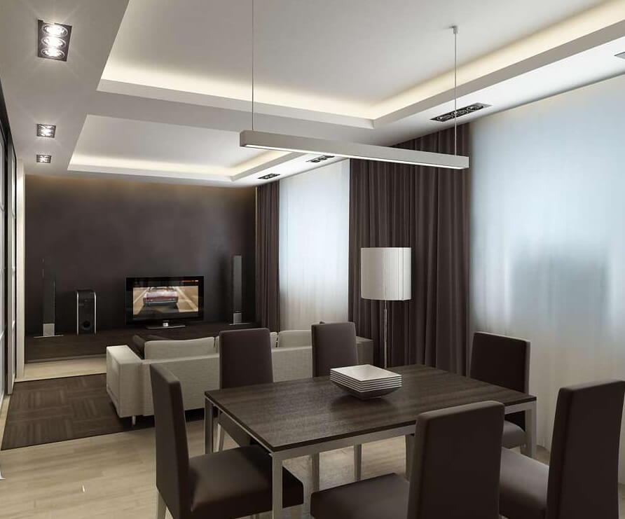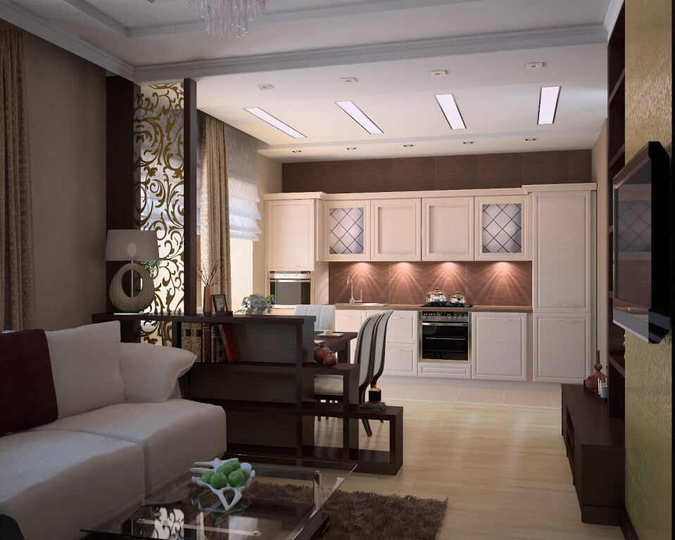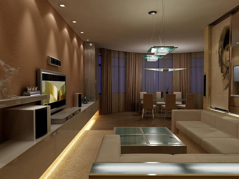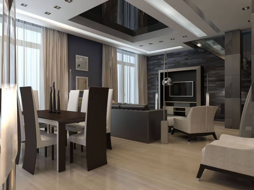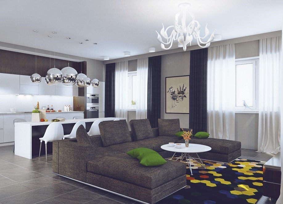 La selección de un área de comedor y un área de recreación en dicha habitación se realiza con objetos, muebles, muebles e iluminación, con colores. En la zonificación, puede usar varios acabados y materiales para revestimientos de pisos y paredes. El lugar para comer debe diferir del área de descanso en color o sombra. La diferenciación de los muebles se lleva a cabo mediante la disposición de sillas, sofás, estanterías. La zonificación más fácil se realiza utilizando un gran arco. Con esta decisión, se proporciona luz y espacio visual de la sala. Una solución inusual y original es dividir el espacio con diferentes niveles de pisos o techos. Deben proporcionarse fuentes de iluminación para niveles múltiples y locales, de modo que no "capturen" otras áreas. En cada área funcional separada, se cuelga una lámpara de techo. El tipo y la forma de la lámpara se seleccionan en función de la altura de los techos. La hermosa retroiluminación LED local en el nivel más bajo ayudará a resaltar efectivamente un lugar de descanso. Cuando se utiliza la zonificación con pisos y techos de varios niveles, las fuentes de iluminación interna se integran orgánicamente en el escalón.