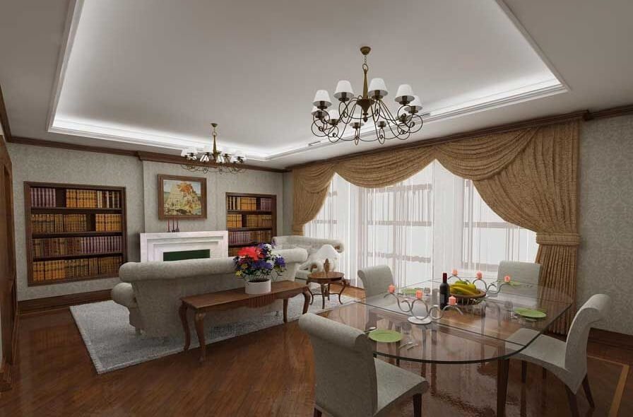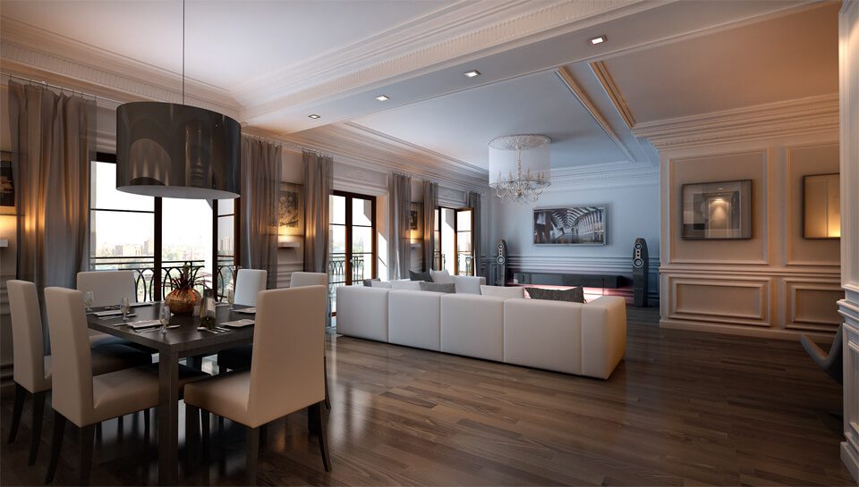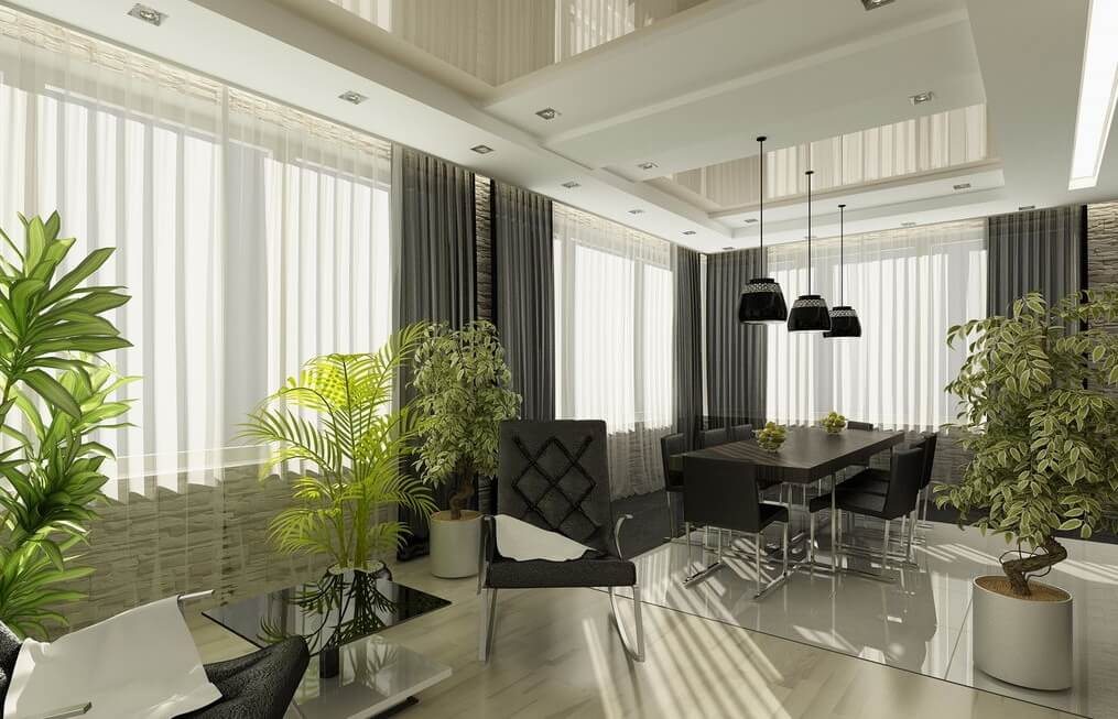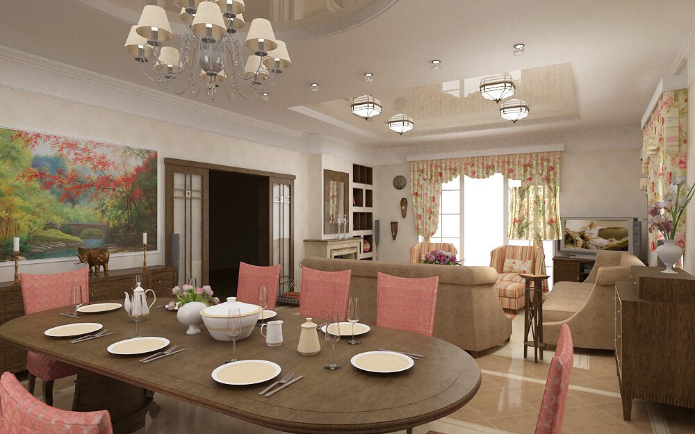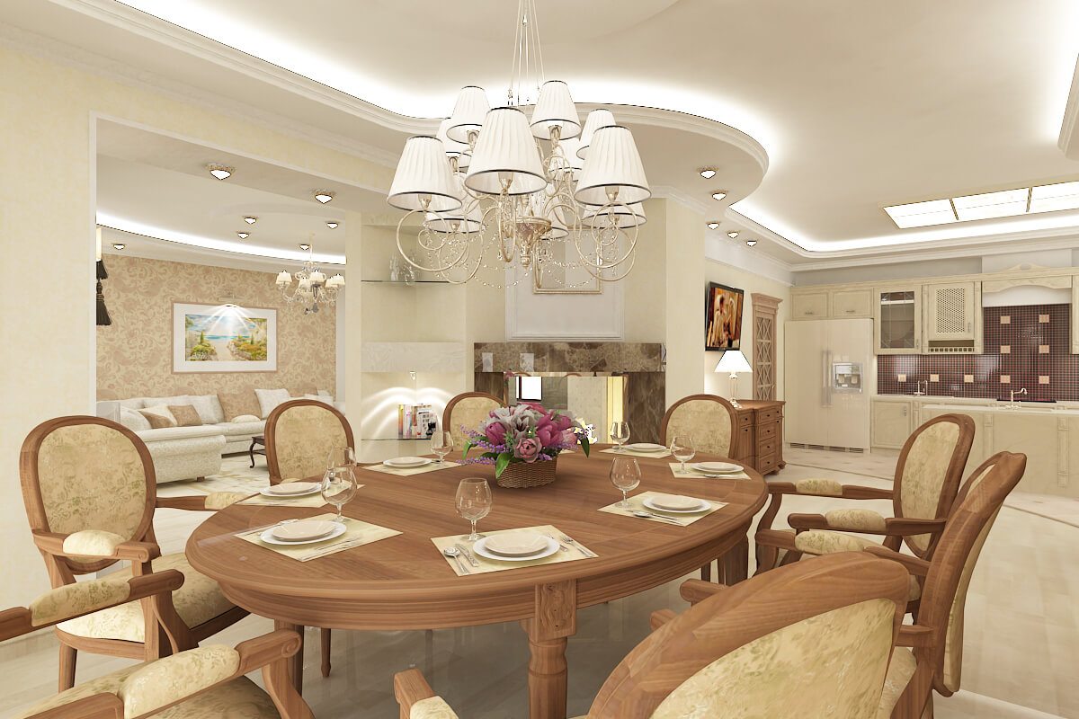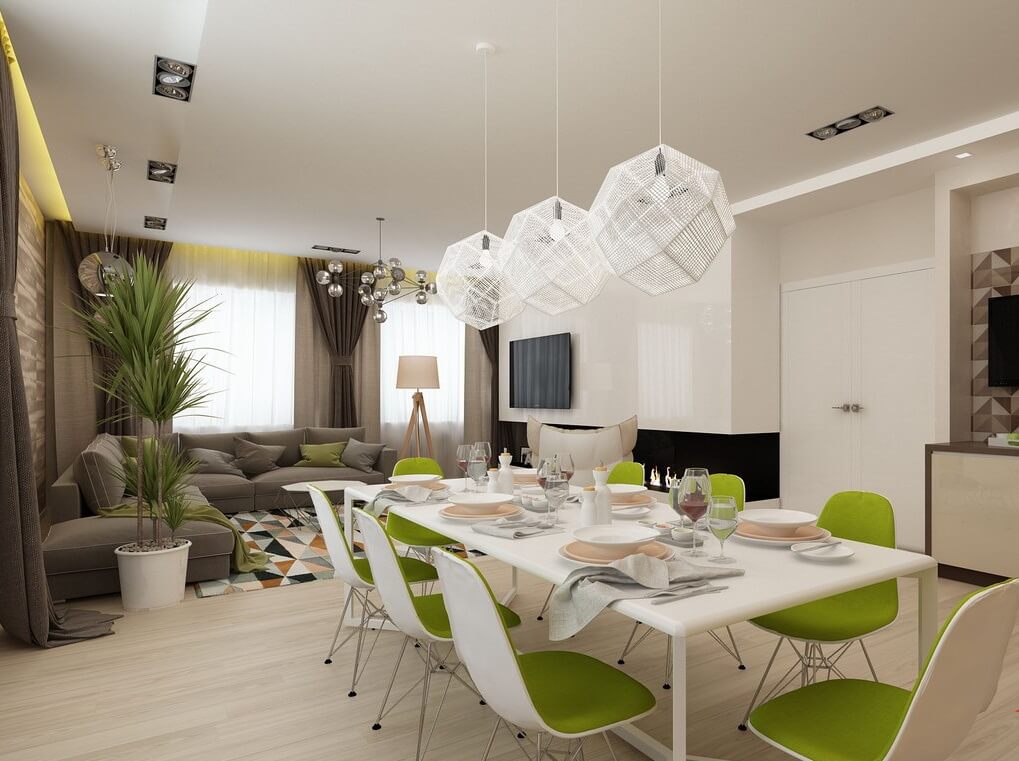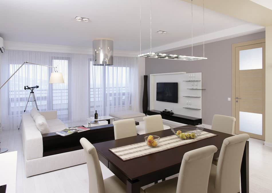 El primer paso en el próximo trabajo debería ser el proyecto. Señala las características de la decoración y la zonificación. Paralelamente, están pensando en materiales que les permitan traducir sus planes en realidad. Luego, se aplican grandes objetos de mobiliario al plan, preguntándose cuál será su ubicación óptima. El diseño decorativo completa la fase preparatoria. También vale la pena considerar las características de cada una de las habitaciones. Por ejemplo, los huéspedes pueden comer y mirar televisión al mismo tiempo o disfrutar de las vistas desde las ventanas panorámicas. En consecuencia, es necesario considerar tal disposición de la mesa del comedor para que nada oscurezca la vista desde este punto. Esto es especialmente cierto para particiones y muebles, que pueden actuar como delimitadores de espacio e interferencia artificial. También tenga en cuenta la presencia de una breve transición del comedor a la cocina, ya que desde allí deberá transferir constantemente platos vacíos y llenos. La trayectoria no debe ser complicada con muchos obstáculos en forma de sofás y mesas de café. Por esta razón, no se aconseja al comedor "esconderse" en la esquina más alejada. Si no hay otras opciones, el pasaje se libera al máximo. A menudo hay opciones combinadas "triples" cuando no transfieren el comedor a la habitación de invitados, sino que desmontan la pared entre este último y la cocina. Por lo tanto, en una habitación se recogen hasta tres zonas funcionales.