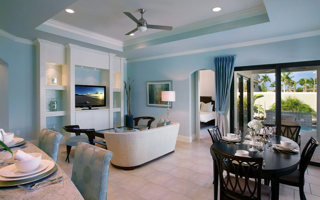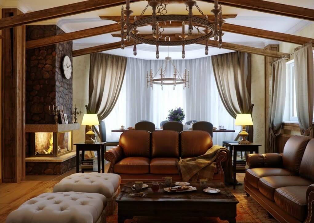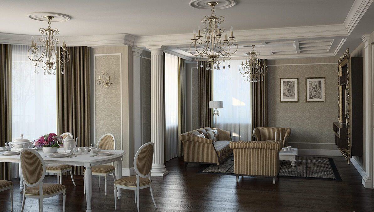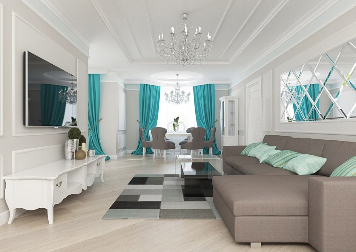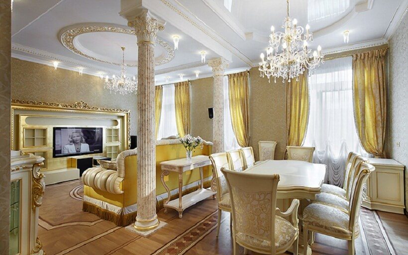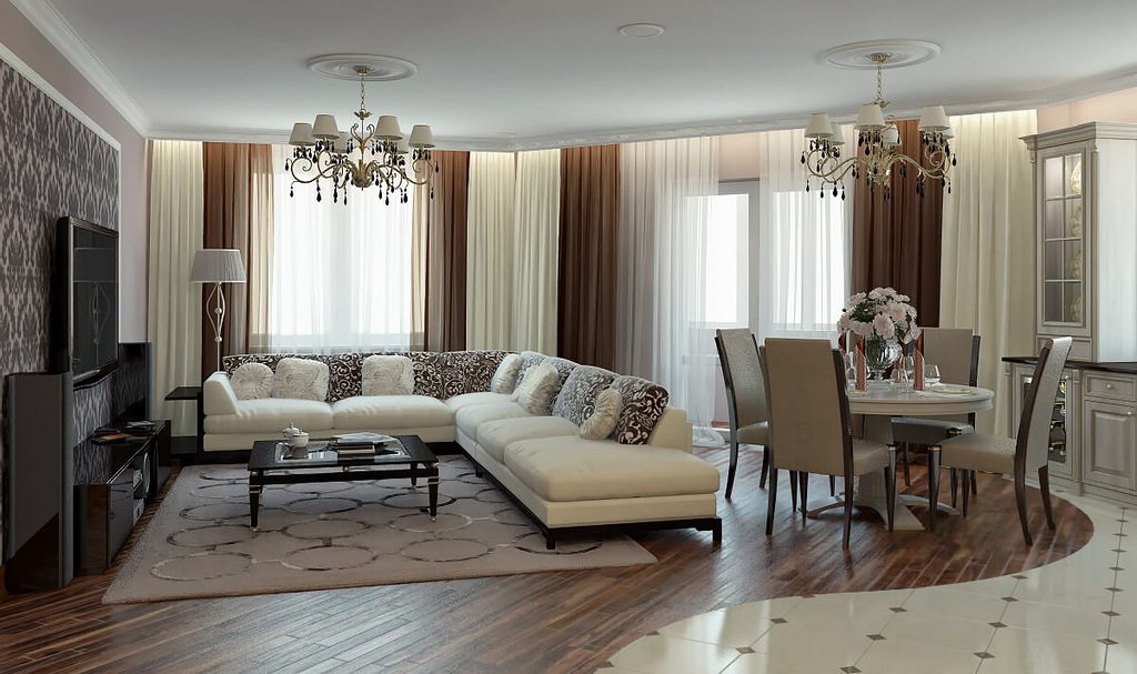 Se recomienda elegir muebles que coincidan con la decisión de estilo. El comedor y el conjunto de asientos deben tener una similitud enfatizada en los detalles, pero diferencias en el material de ejecución, textiles e incluso colores. El mínimo de muebles incluye: una mesa de comedor con sillas, un sofá, sillones y una mesa de café, espacio de almacenamiento (armarios, estanterías, vestidores), un soporte de TV. Esta lista se puede complementar según las dimensiones de la sala principal: las habitaciones con un área de 10 metros cuadrados ya permiten el uso de objetos interiores adicionales.