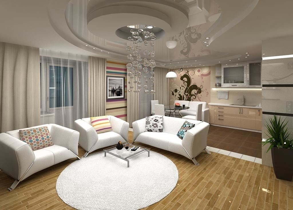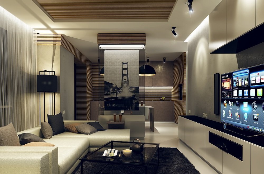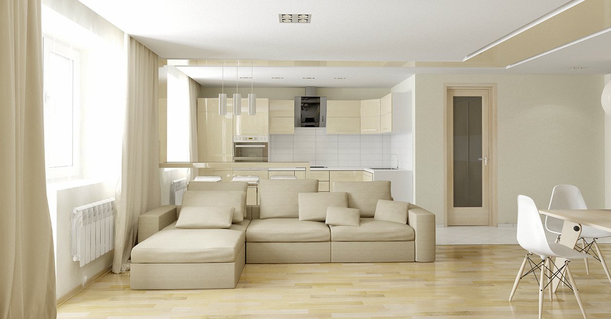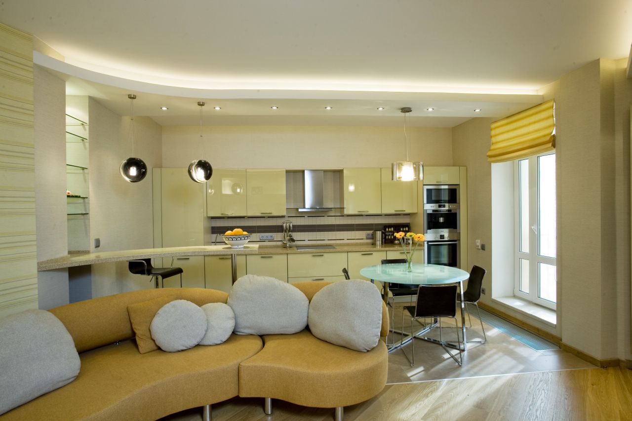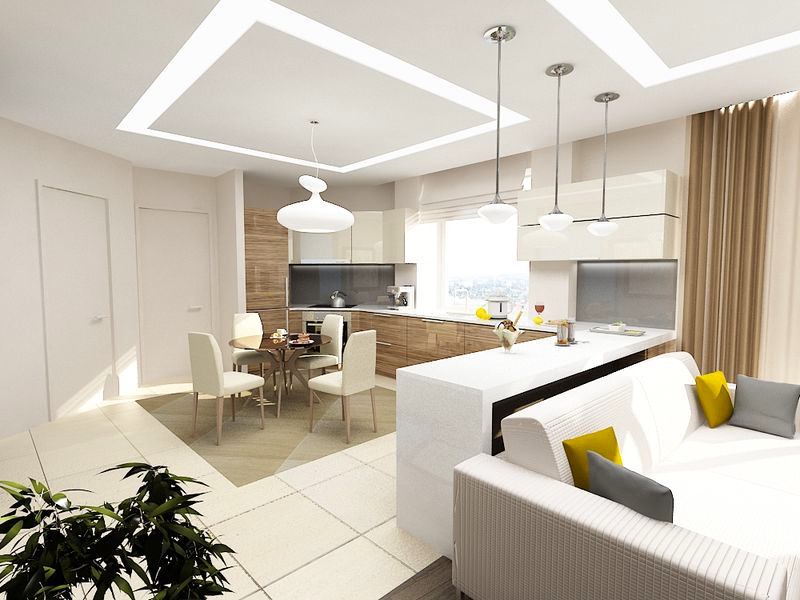 El diseño interior de la cocina-sala de estar está asociado con una serie de matices. Para empezar, uno no debe permitir la penetración del microclima agresivo del sitio culinario en el área de recreación.La campana y el sistema de ventilación deben hacer frente a las tareas, para que la sala no sufra cambios constantes de temperatura y alta humedad. Se recomienda, por supuesto, establecer la separación real de zonas. Al menos un poco, pero protege la habitación de la cocina y los subproductos de la cocina (olor y grasa). Además, los profesionales aconsejan usar un mínimo de textiles. En cualquier caso, deberá lavarlo con frecuencia. Para muebles tapizados, es mejor proporcionar cubiertas protectoras especiales. Es imposible usar materiales sintéticos en el diseño, que rápidamente se volverán inútiles con los lavados frecuentes. El espacio debe combinarse de manera competente. La sala en esta situación actúa como la sala "principal". La cocina a menudo se le da un pequeño rincón. La opción de separar los dos espacios con una barra de mostrador o encimera con una estufa es relevante. La última decisión que pudo ver en los programas de cocina. En habitaciones grandes (en casas de campo o casas de campo), donde hay espacio para "maniobras", organizan una unidad de cocina tipo isla. Este tipo de diseño se considera elegante y de moda.