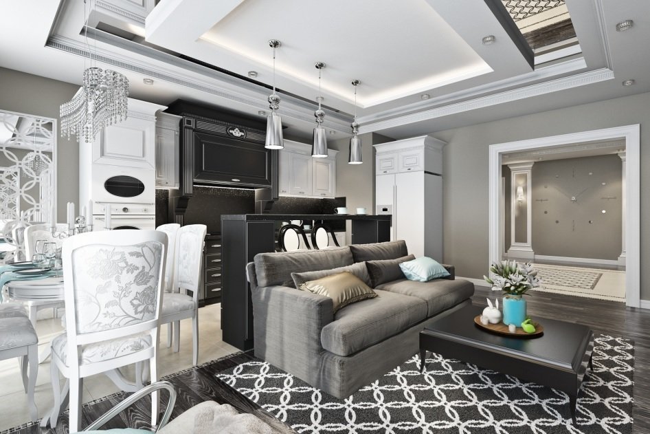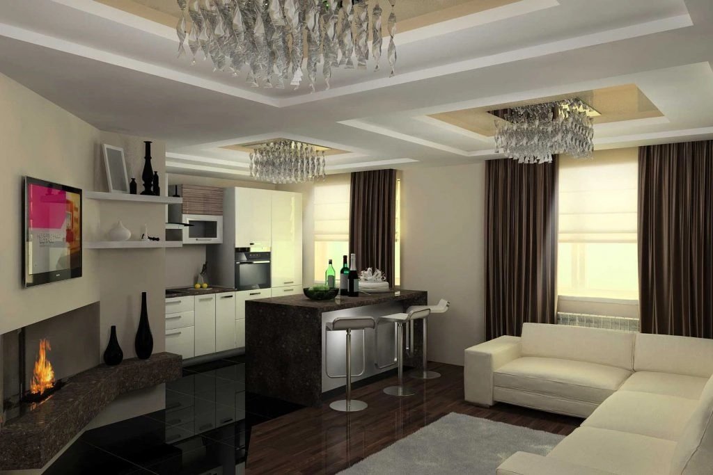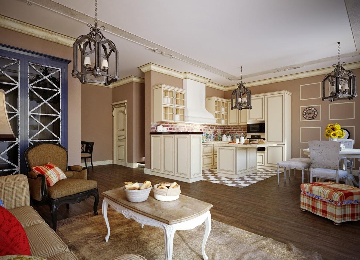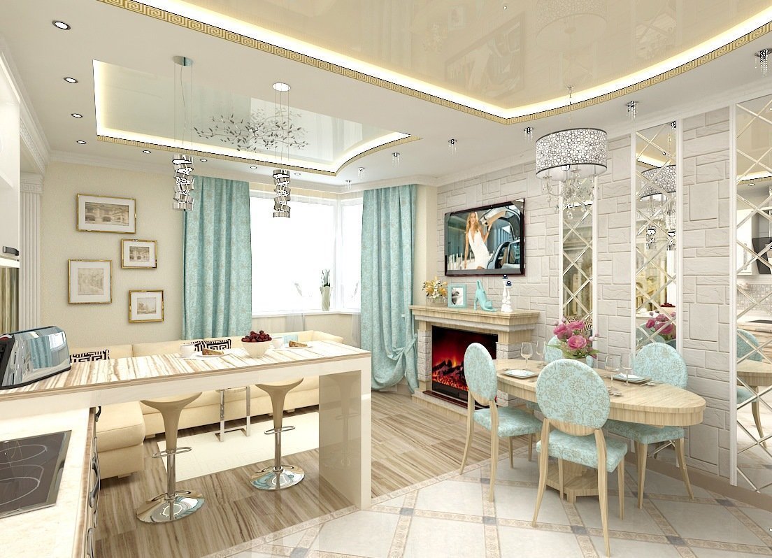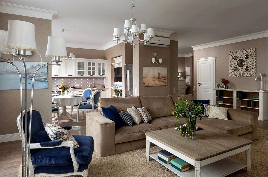 Los clásicos, a pesar de pertenecer a los viejos estilos, siguen siendo relevantes hasta nuestros días. La dirección ha cambiado ligeramente, se ha vuelto más elegante, ha permitido que los electrodomésticos modernos ingresen a los interiores, sin los cuales ya no es posible, pero se mantuvo fiel a sí misma y a sus reglas. En el estilo clásico, las columnas decorativas se utilizan para separar las zonas. Se fusionan orgánicamente en la atmósfera y armonizan con molduras de estuco en el techo. Las paredes están enlucidas o empapeladas con motivos florales. El piso está terminado con parquet o laminado. La tapicería de los muebles tapizados está repleta de un pequeño estampado floral. Las ventanas están cubiertas con cortinas pesadas hechas de tela natural, que se atan por la tarde con cuerdas limpias con borlas en los extremos. Se instala una chimenea decorativa decorada con piedra artificial o estuco en la sala de estar. Pufs, mesas de café, cajoneras y armarios se alzan sobre elegantes patas retorcidas. Las paredes están decoradas con reproducciones de pinturas de artistas famosos en marcos de baguette con dorado. Una pesada lámpara de araña de cristal cuelga del techo. Los tonos de marrón prevalecen en el esquema de color: dorado, arena, beige, crema. Como contraste, agregue un par de "manchas" de vino, terracota y azul.