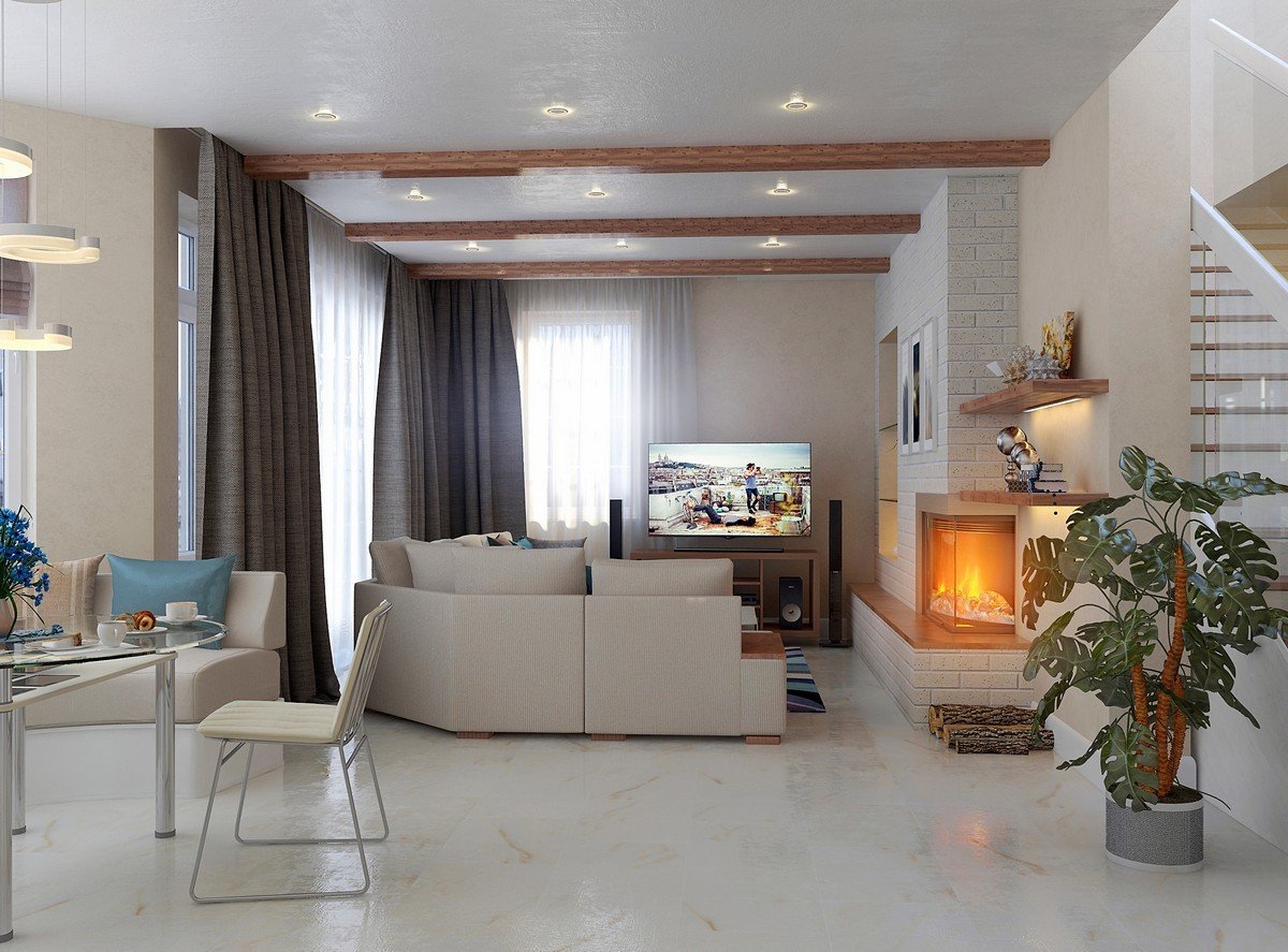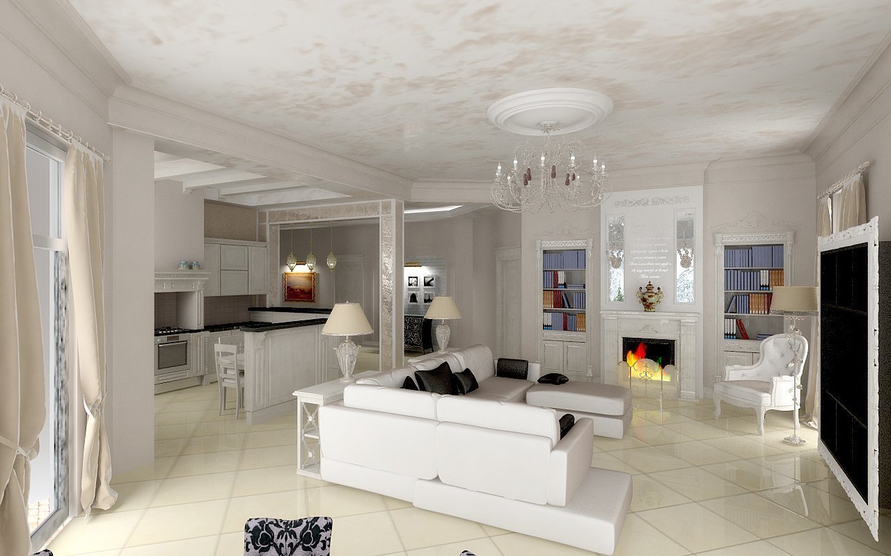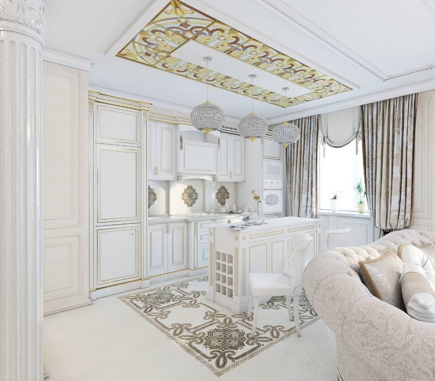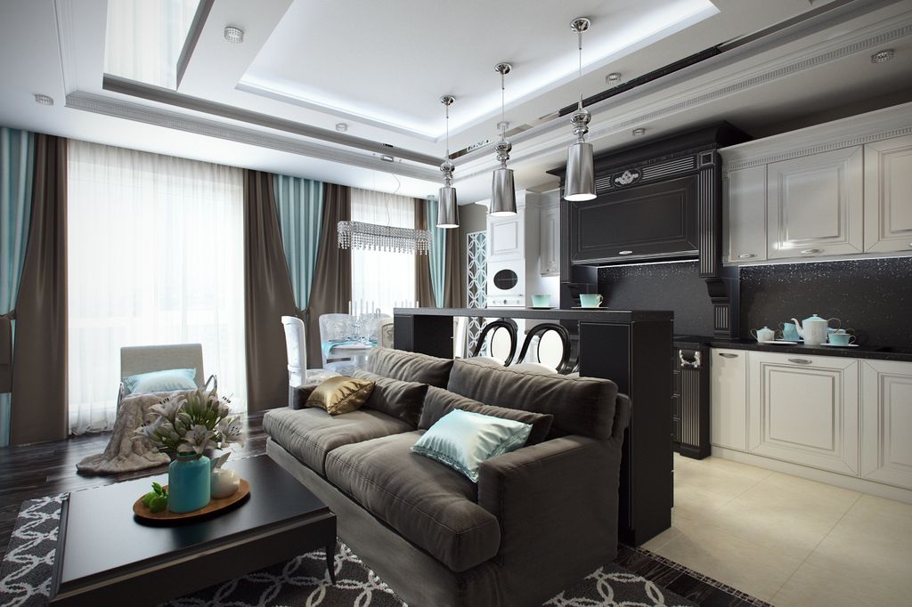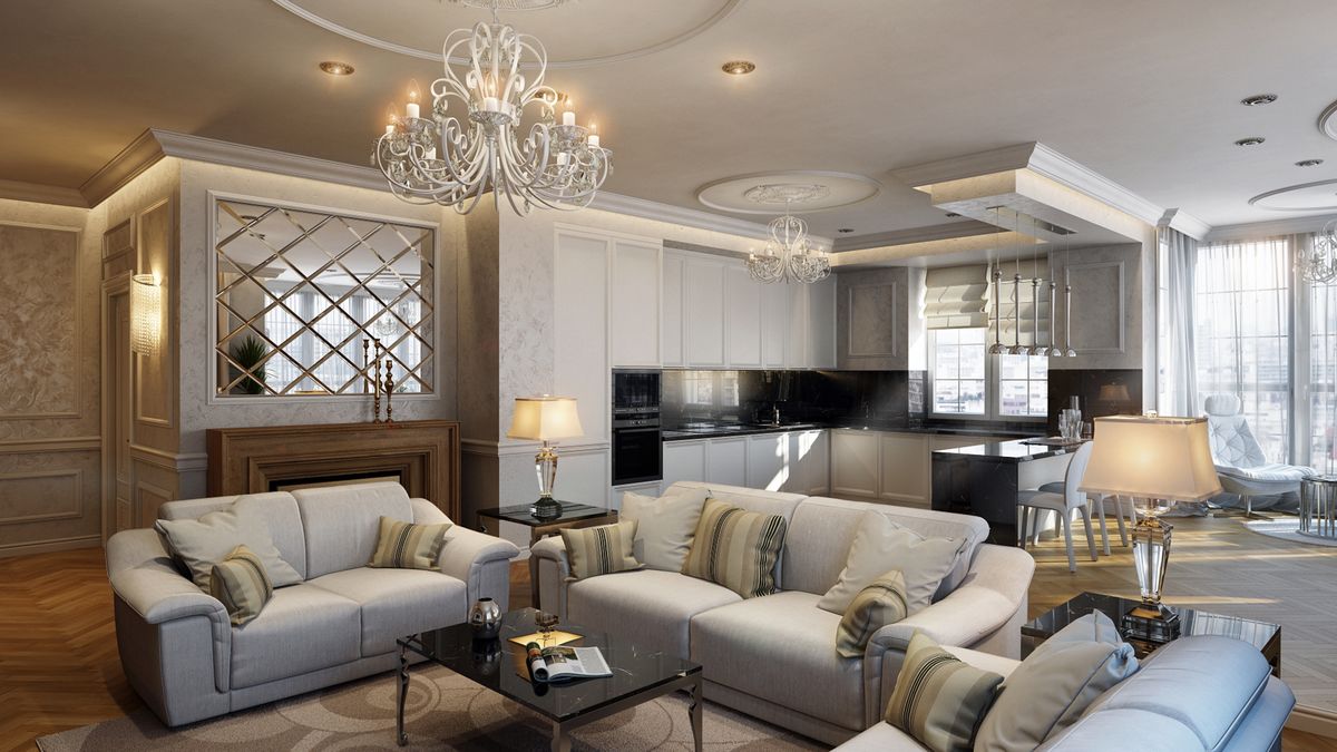 Los clásicos, a pesar de pertenecer a los viejos estilos, siguen siendo relevantes hasta nuestros días. La dirección ha cambiado ligeramente, se ha vuelto más elegante, ha permitido que los electrodomésticos modernos ingresen a los interiores, sin los cuales ya no es posible, pero se mantuvo fiel a sí misma y a sus reglas. En el estilo clásico, las columnas decorativas se utilizan para separar las zonas. Se fusionan orgánicamente en la atmósfera y armonizan con molduras de estuco en el techo. Las paredes están enlucidas o empapeladas con motivos florales. El piso está terminado con parquet o laminado. La tapicería de los muebles tapizados está repleta de un pequeño estampado floral. Las ventanas están cubiertas con cortinas pesadas hechas de tela natural, que se atan por la tarde con cuerdas limpias con borlas en los extremos. Se instala una chimenea decorativa decorada con piedra artificial o estuco en la sala de estar. Pufs, mesas de café, cajoneras y armarios se alzan sobre elegantes patas retorcidas. Las paredes están decoradas con reproducciones de pinturas de artistas famosos en marcos de baguette con dorado. Una pesada lámpara de araña de cristal cuelga del techo. Los tonos de marrón prevalecen en el esquema de color: dorado, arena, beige, crema. Como contraste, agregue un par de "manchas" de vino, terracota y azul.