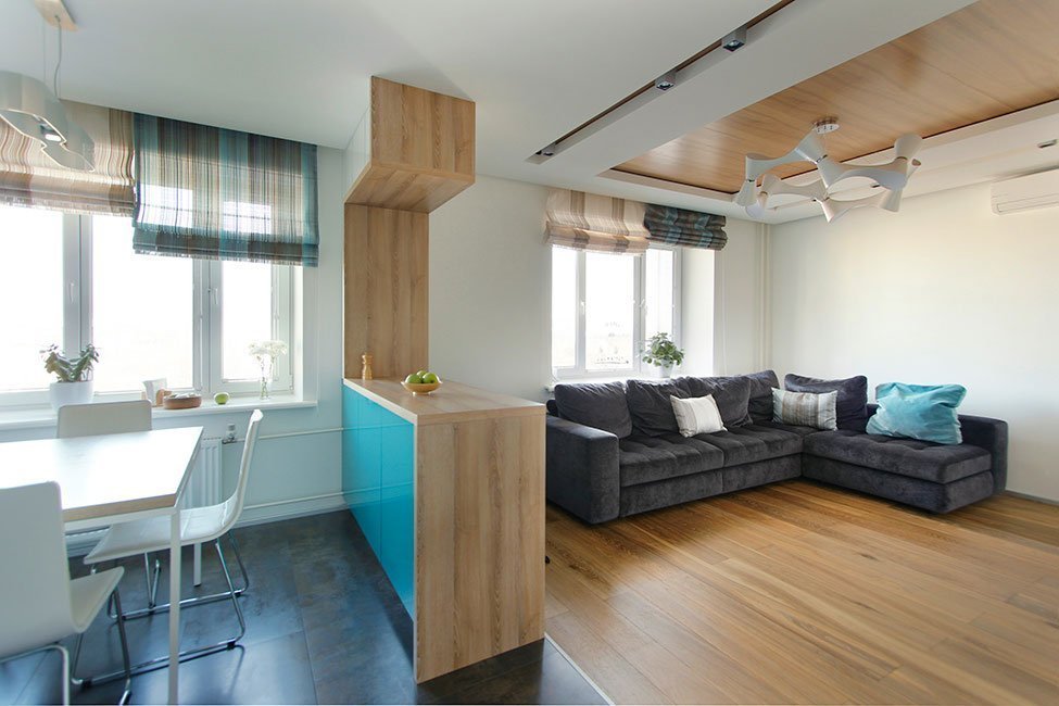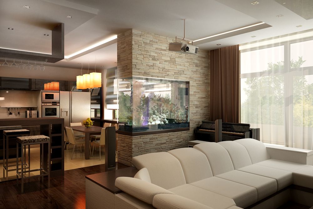 Ahorro de espacio. En algunos casos, esta es incluso la única oportunidad de equipar una zona adicional. Al reconstruir un apartamento a partir de dos habitaciones pequeñas, puede hacer una, pero espaciosa. Por ejemplo, la pequeña cocina parecía tan pequeña que incluso mirarla era "pequeña". Cualquier truco de diseñadores no salva la situación. La demolición de la pared y la instalación de una partición decorativa con nichos o una barra de bar ayudarán a cambiar radicalmente la percepción de esta habitación. Ahora, inconscientemente, se considerará como una continuación de una espaciosa habitación de invitados.