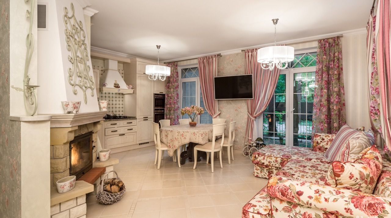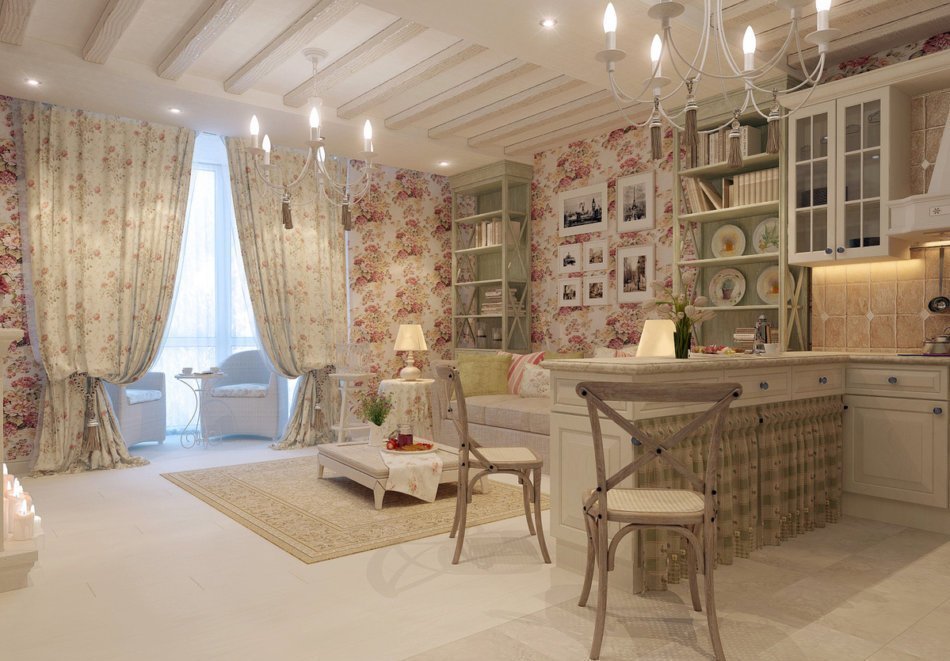 El salón de estilo provenzal tiene una atmósfera especial de antigüedad acogedora y romántica. Blanco, beige, rosa y azul prevalecen en el esquema de color. Los tonos suaves y tranquilos se animan debido a la abundancia de motivos florales en el papel pintado y en los textiles. El piso está terminado con un tablero de parquet, que además está pintado de blanco. Solo se aplica una capa para que los trazos gruesos sean visibles en la superficie. El mobiliario utiliza antigüedades o detalles exclusivos, envejecidos artificialmente. Se presta especial atención a la decoración: pequeñas almohadas, colchas, figuritas, floreros y macetas con plantas vivas. Una lámpara pesada con bombillas que imitan velas está colgada en el techo. Además está decorado con perlas artificiales. El piso está cubierto con una alfombra suave con un patrón geométrico clásico. Las paredes están decoradas con pinturas pintorescas en marcos redondos.