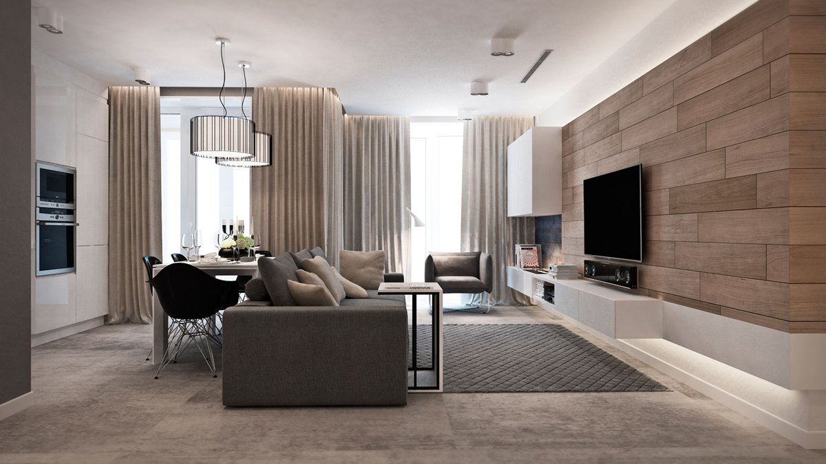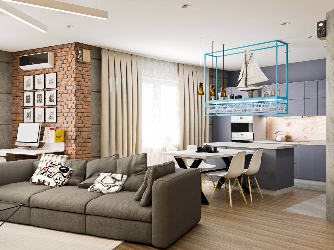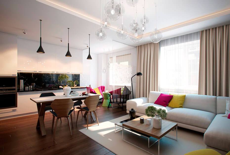 El salón-estudio pertenece al local universal. La sala tolerará cualquier "vecindario". Se combina con cocinas, dormitorios, comedores, guarderías, talleres y salas de trabajo. Cualquier habitación adicional con la ayuda de una serie de trucos de diseño puede integrarse orgánicamente en el marco de una habitación espaciosa y estrecha. Para los propietarios de apartamentos de dos habitaciones, la tarea se simplifica, ya que es posible organizar una remodelación masiva y combinar los dos espacios en uno solo. El estudio vive según sus propias leyes y no permite el caos en su territorio. Esta sala está estrictamente dividida en zonas, cuya ubicación se guía por consideraciones racionales. La combinación tiene las siguientes ventajas: