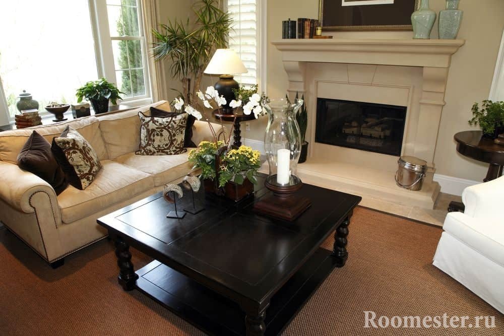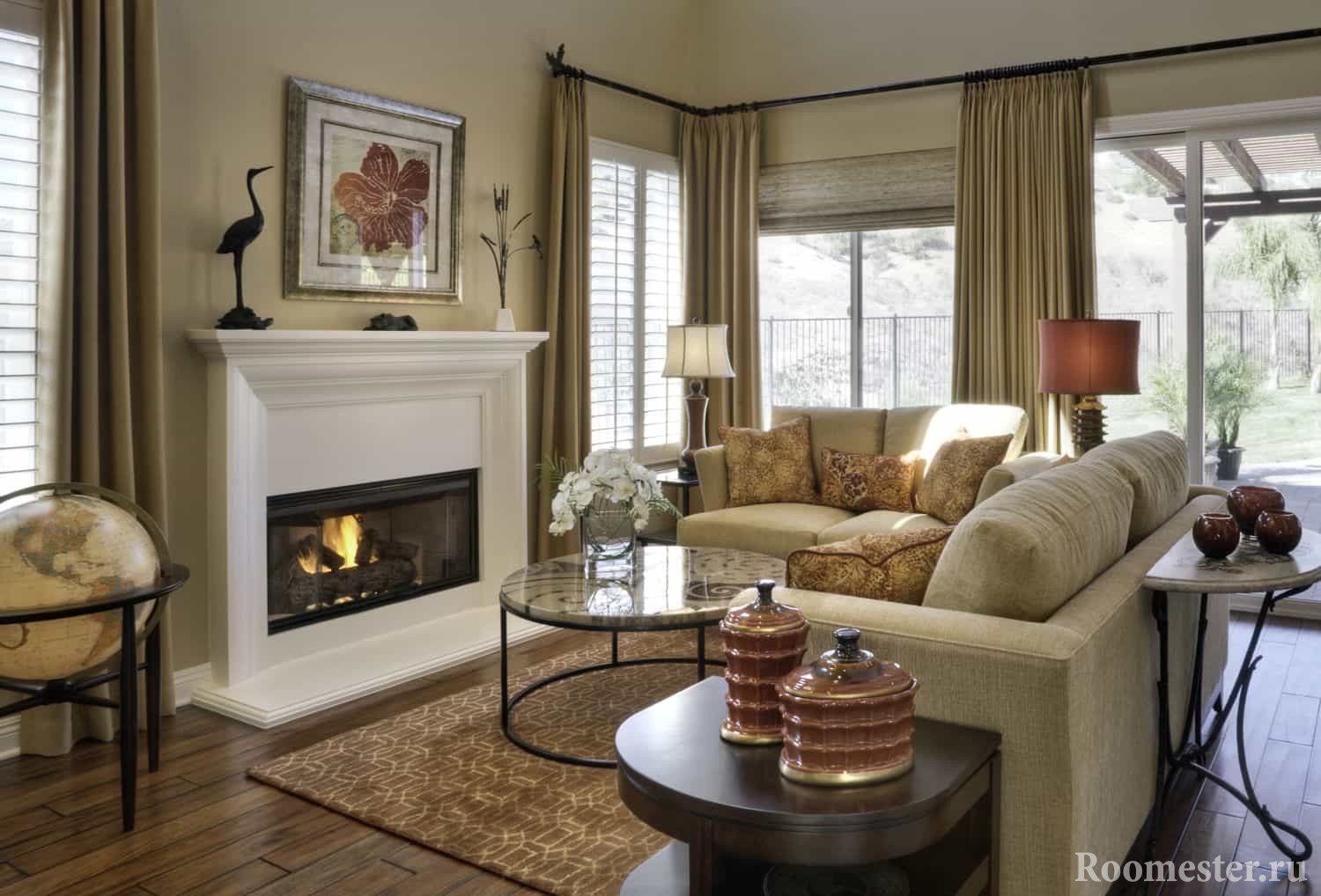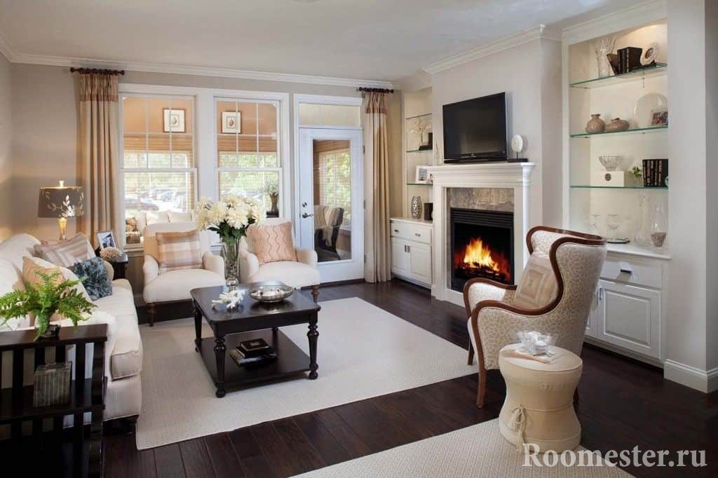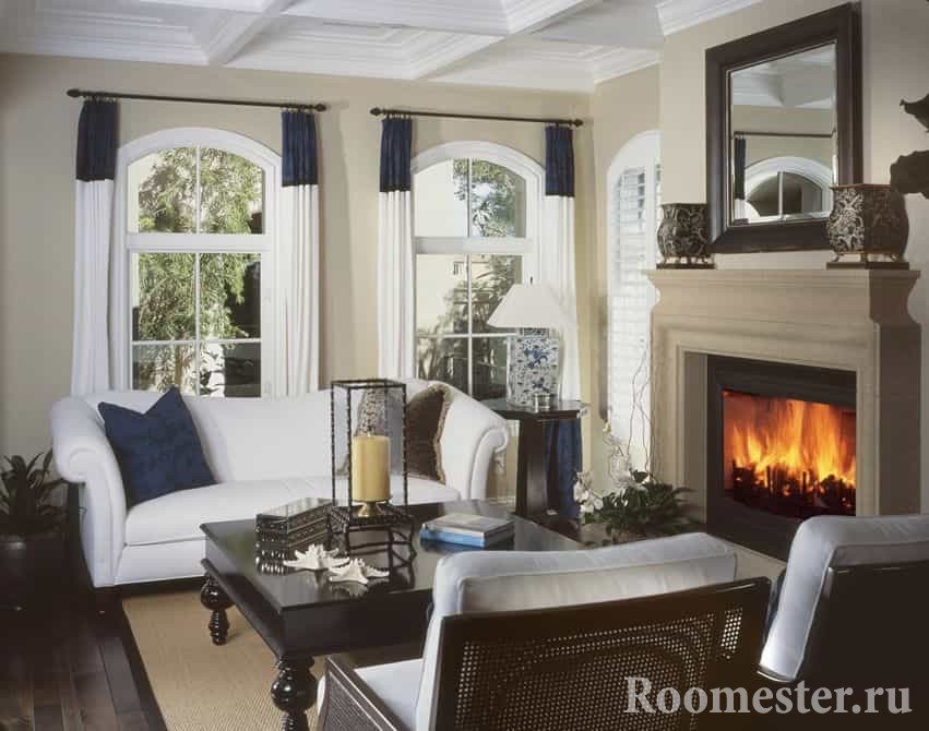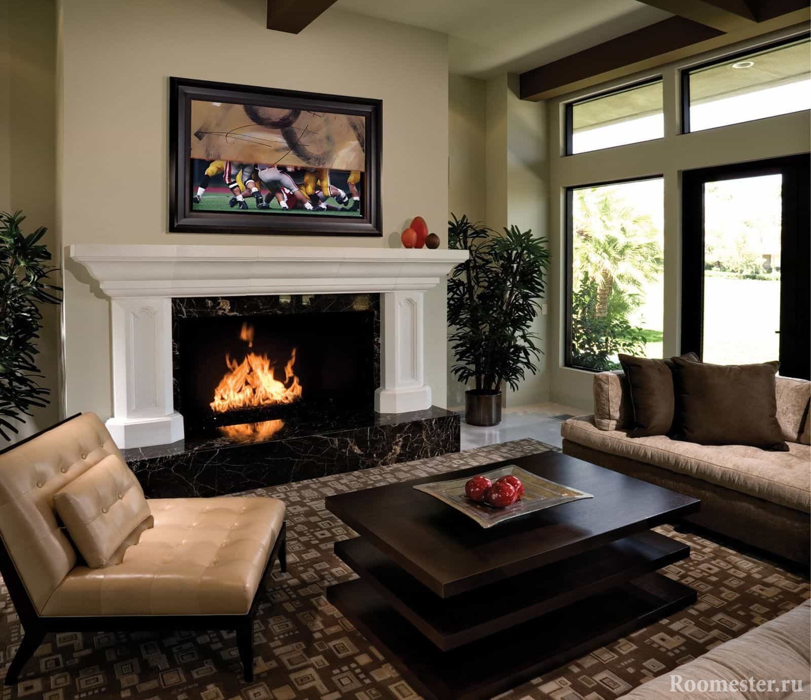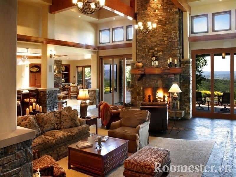 Salón interior con chimenea en la casa: soluciones interesantes y fotos