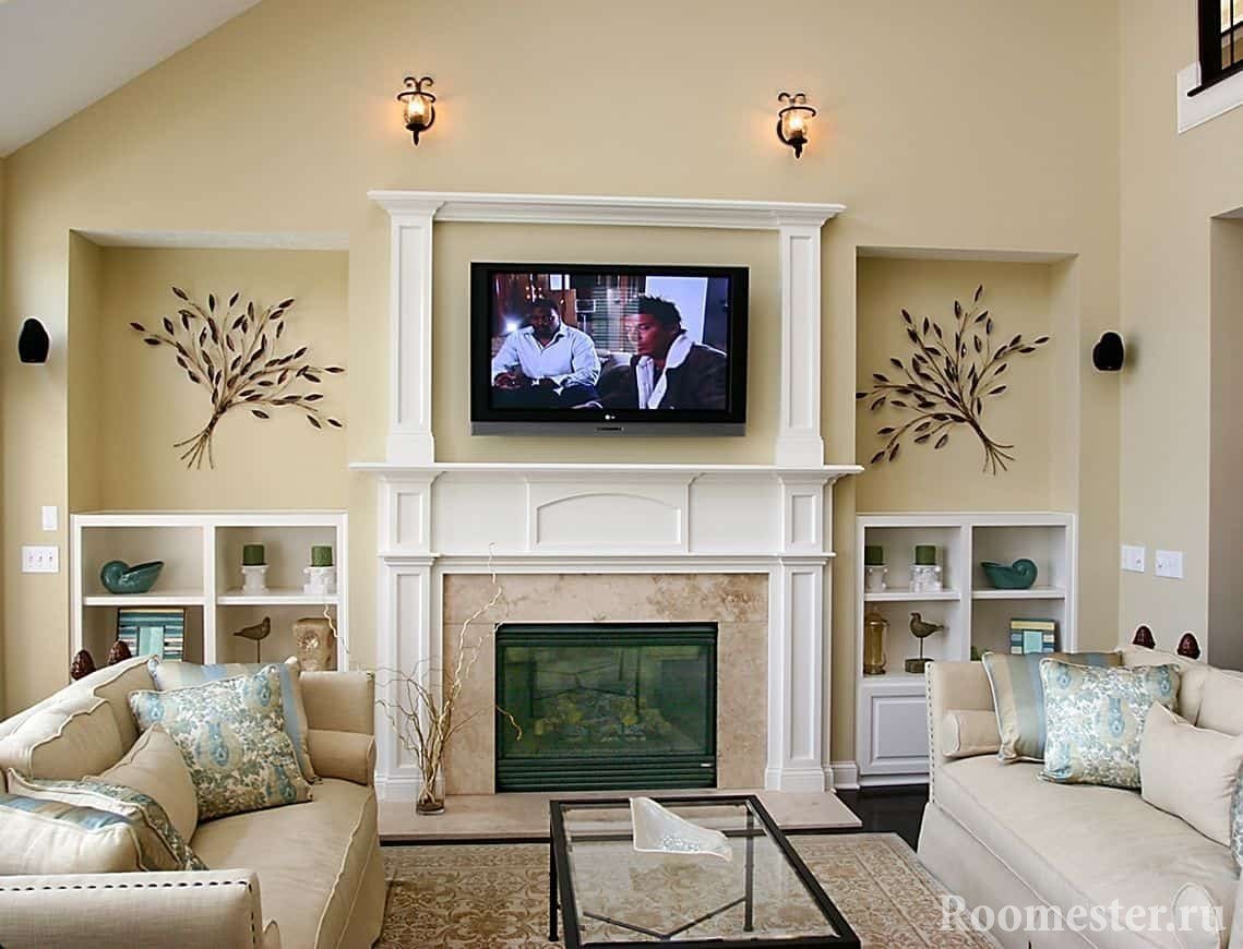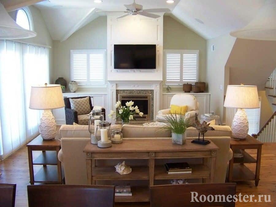 La chimenea de estilo clásico se caracteriza por la presencia de un portal en forma de U, así como una caja de fuego abierta.Los maestros de este estilo utilizan piedra natural, a veces madera o hierro fundido. Para una casa de campo, una sala de estar con chimenea no solo es acogedora, sino también cálida en invierno. Si le atraen las salas de estar con una chimenea inmersa en la pared, ricamente decorada con adornos de madera con motivos celtas o escoceses, tenga en cuenta que este diseño es ideal para una casa de campo privada, cuyo propietario eligió el diseño de estilo de Good Old England.