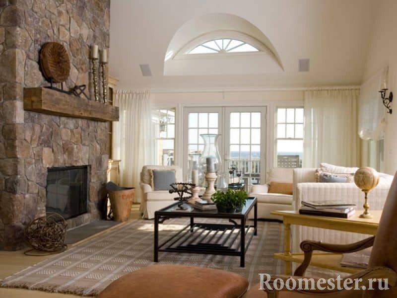 También se llama estilo country. La chimenea de este estilo tiene tamaños pequeños y medianos, en forma de D. En una pequeña sala de estar se instalan como pared y esquina.Para el diseño del portal, se utilizan materiales naturales y artificiales de bajo costo, por ejemplo, roca de concha, arenisca. Un rasgo característico de este estilo es la disposición de un nicho especial separado donde se almacena la leña. Una sala de estar con tal chimenea a menudo está decorada en una casa de campo.