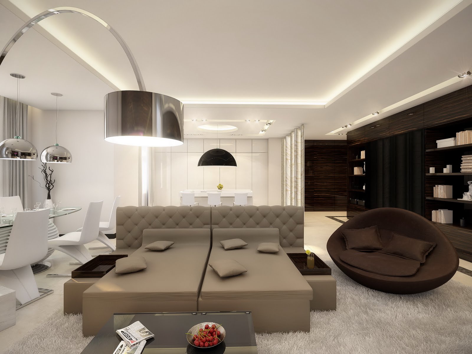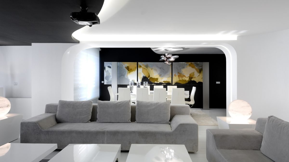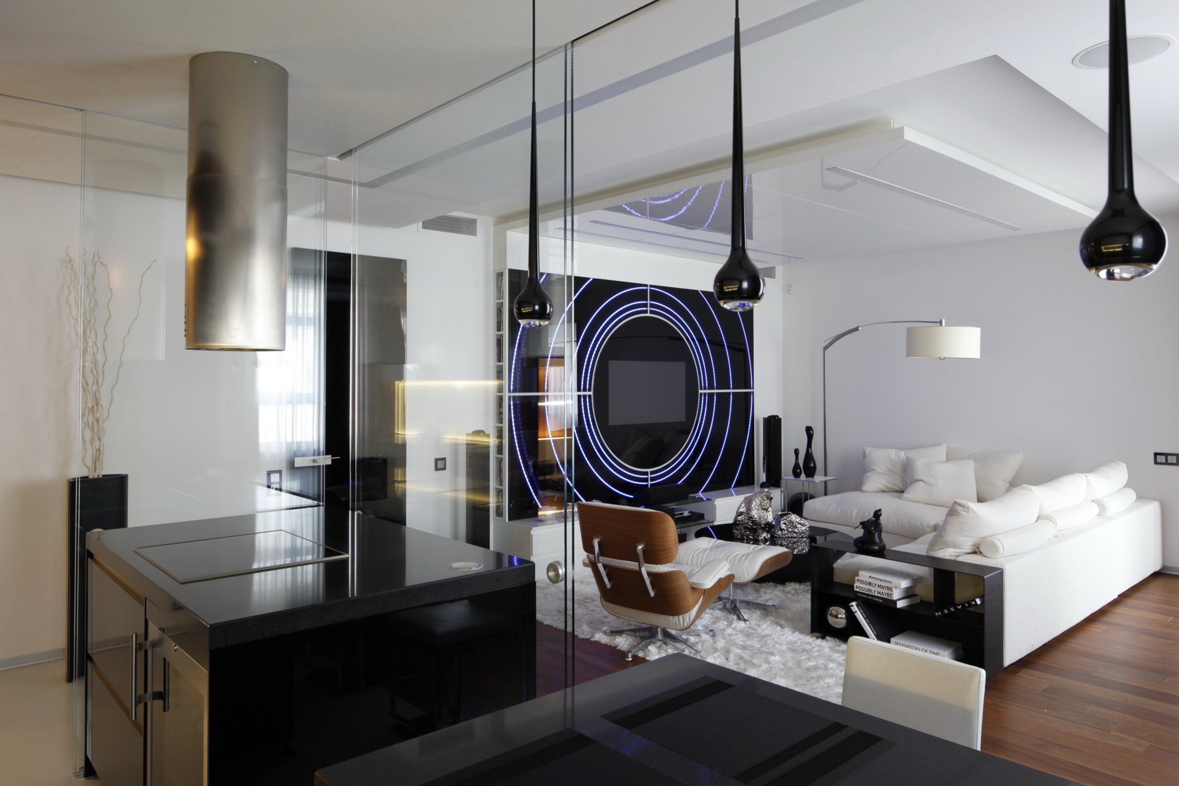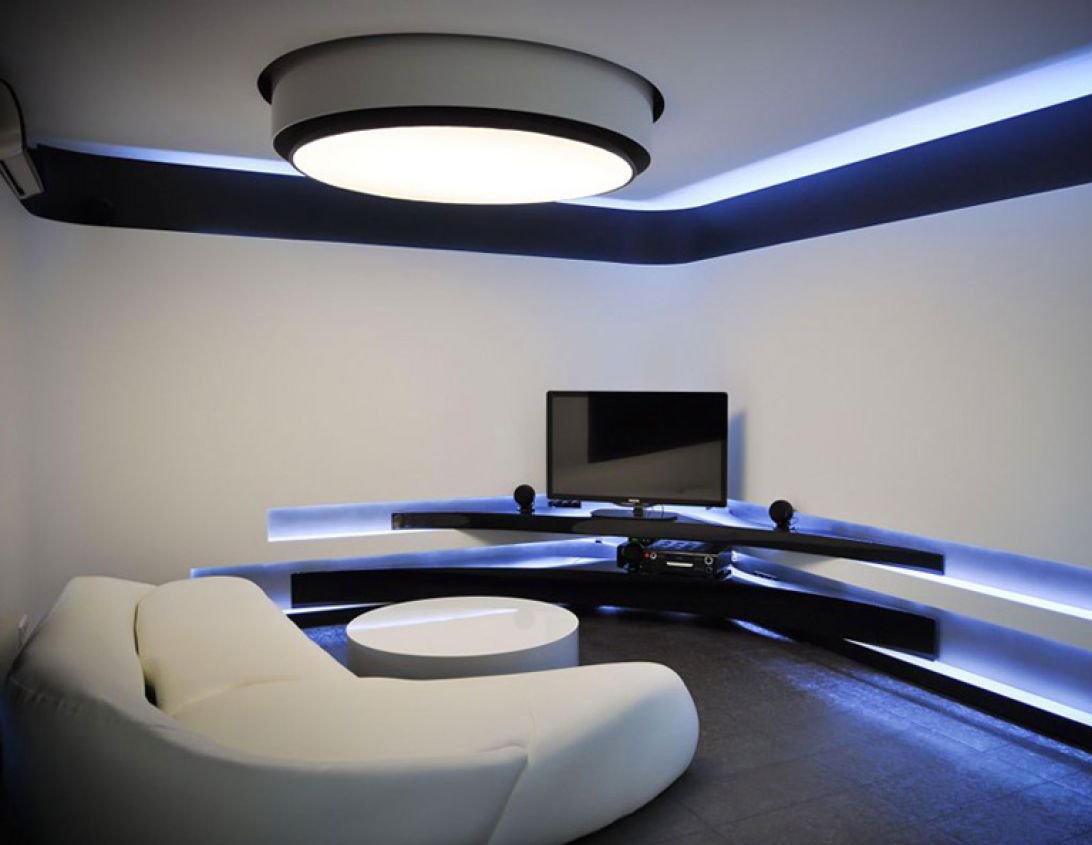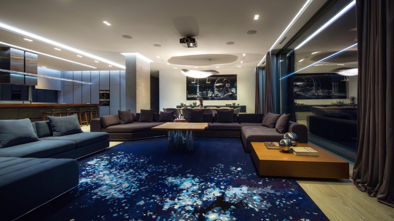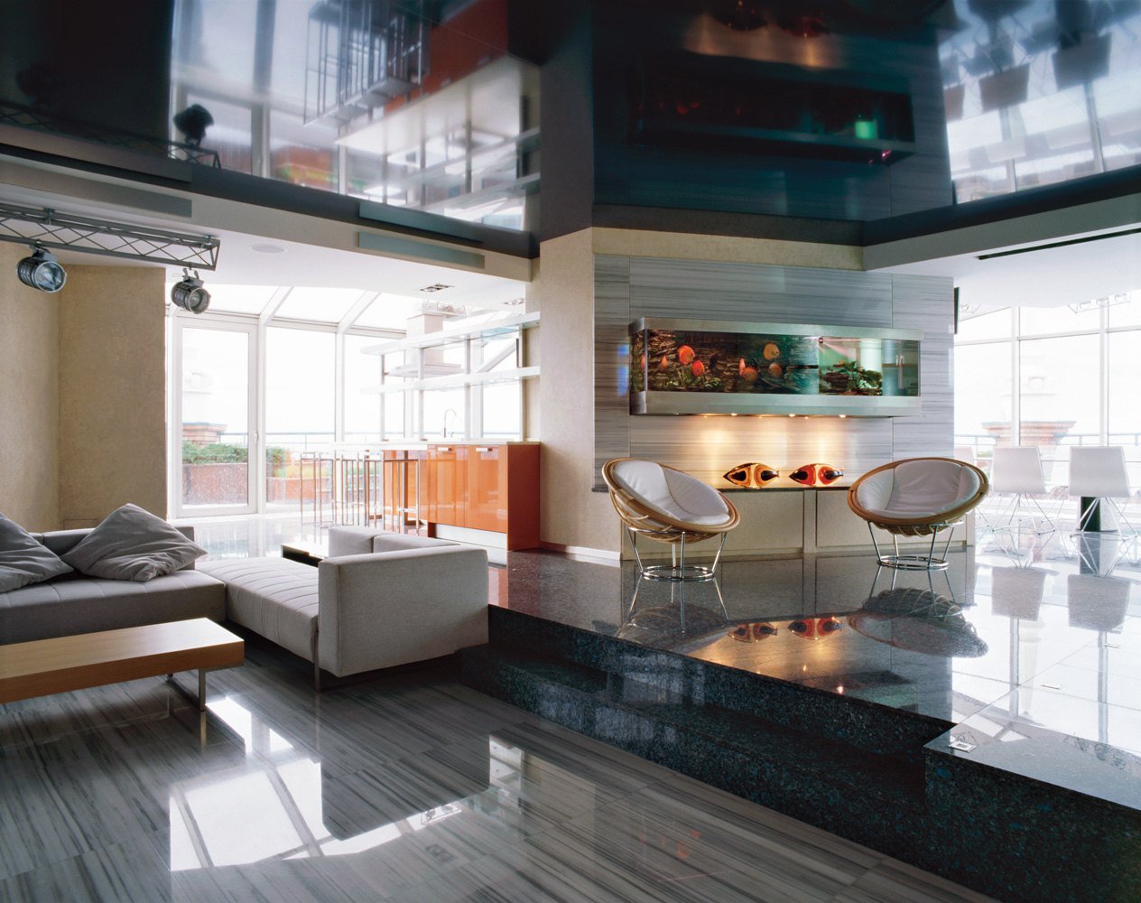 Las salas de alta tecnología están inundadas de luz artificial que juega con los reflejos del brillo de las superficies de los muebles y los materiales de decoración.