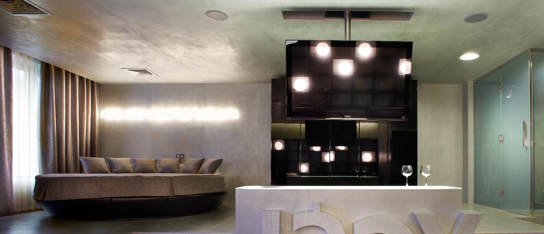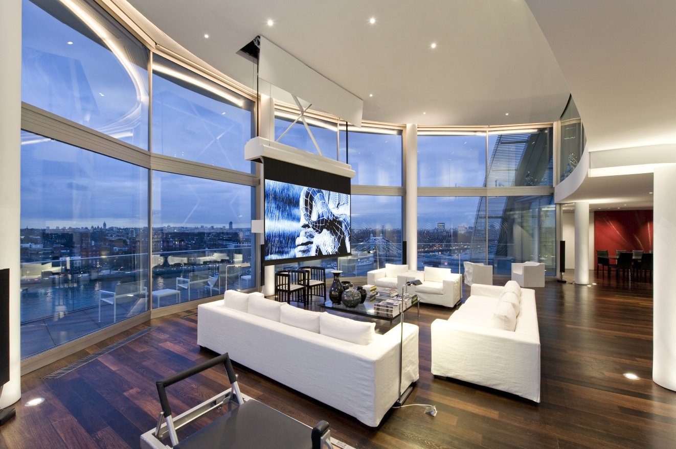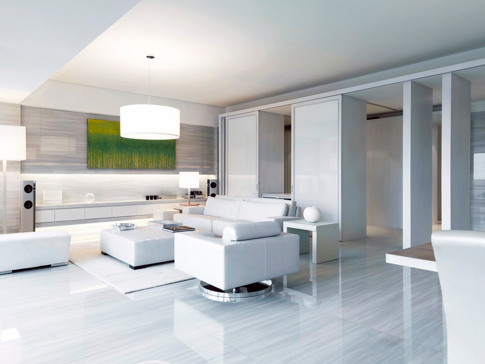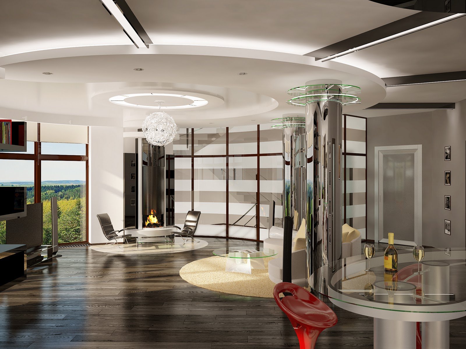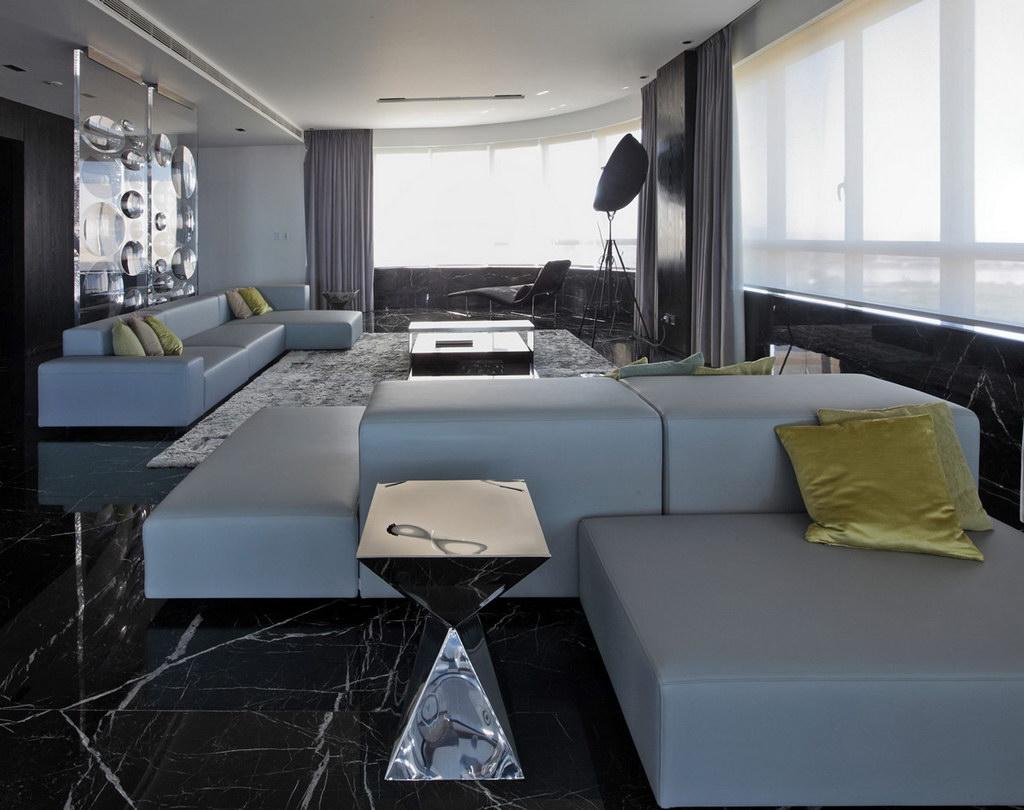 Las salas de alta tecnología están inundadas de luz artificial que juega con los reflejos del brillo de las superficies de los muebles y los materiales de decoración.