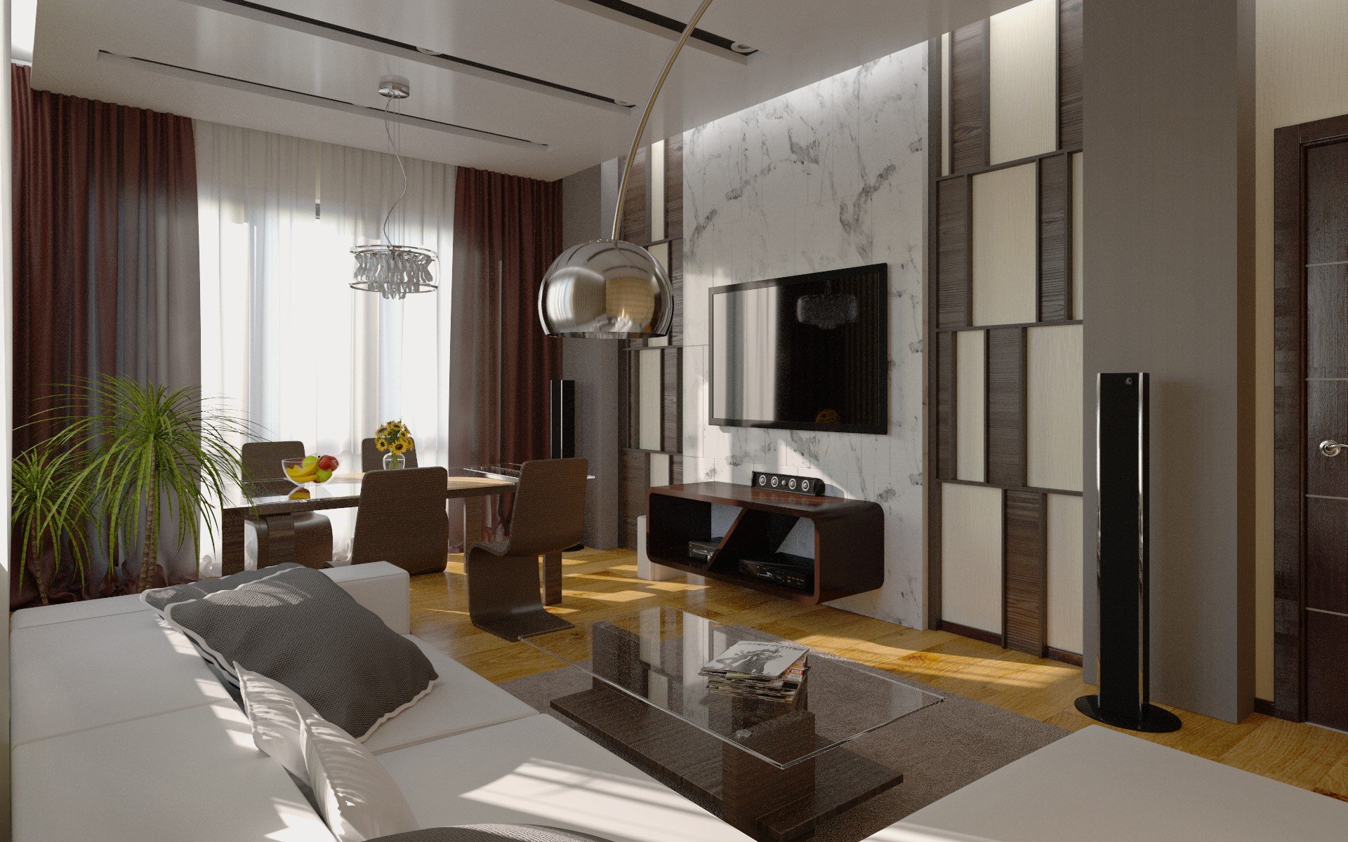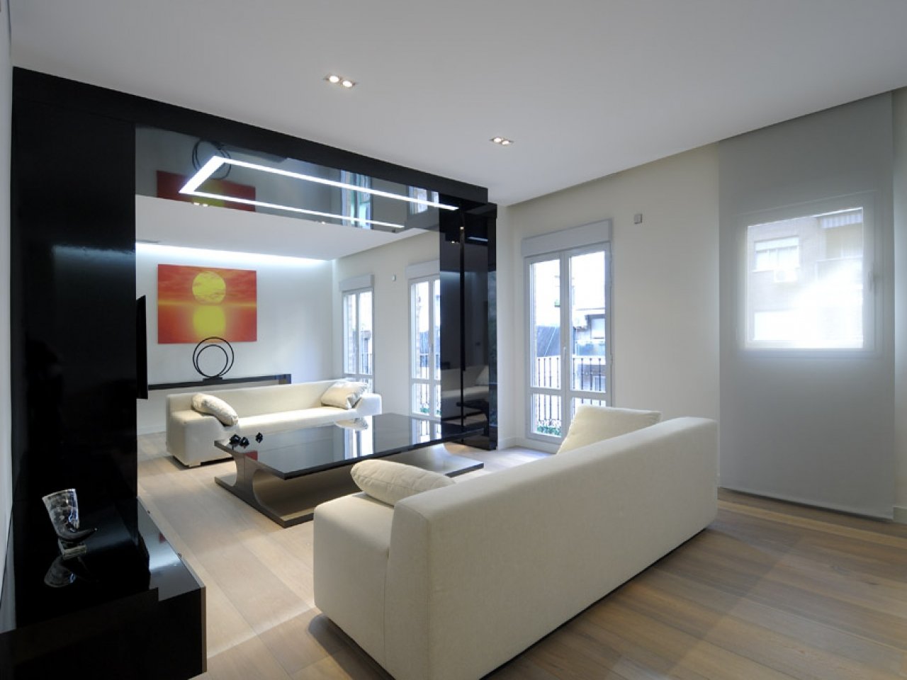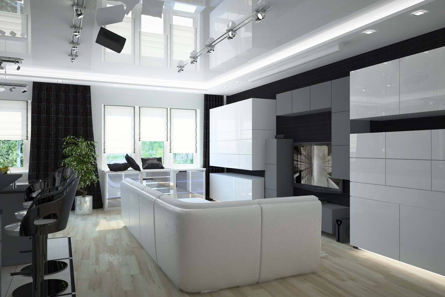 Aunque los espacios libres son característicos de la alta tecnología, la idea de habitaciones combinadas con estilo a menudo se materializa. Las habitaciones combinadas se dividen en zonas fácilmente combinando colores, texturas y bordes condicionales de los accesorios de iluminación.