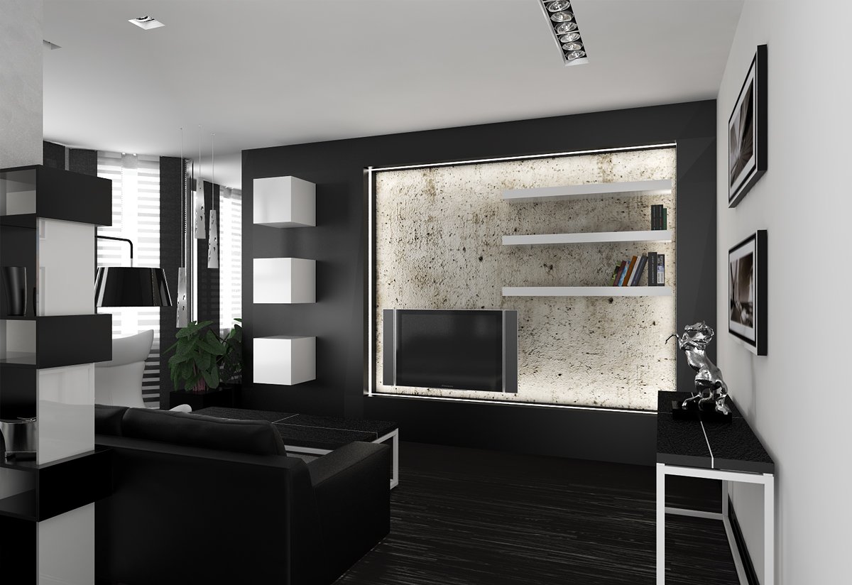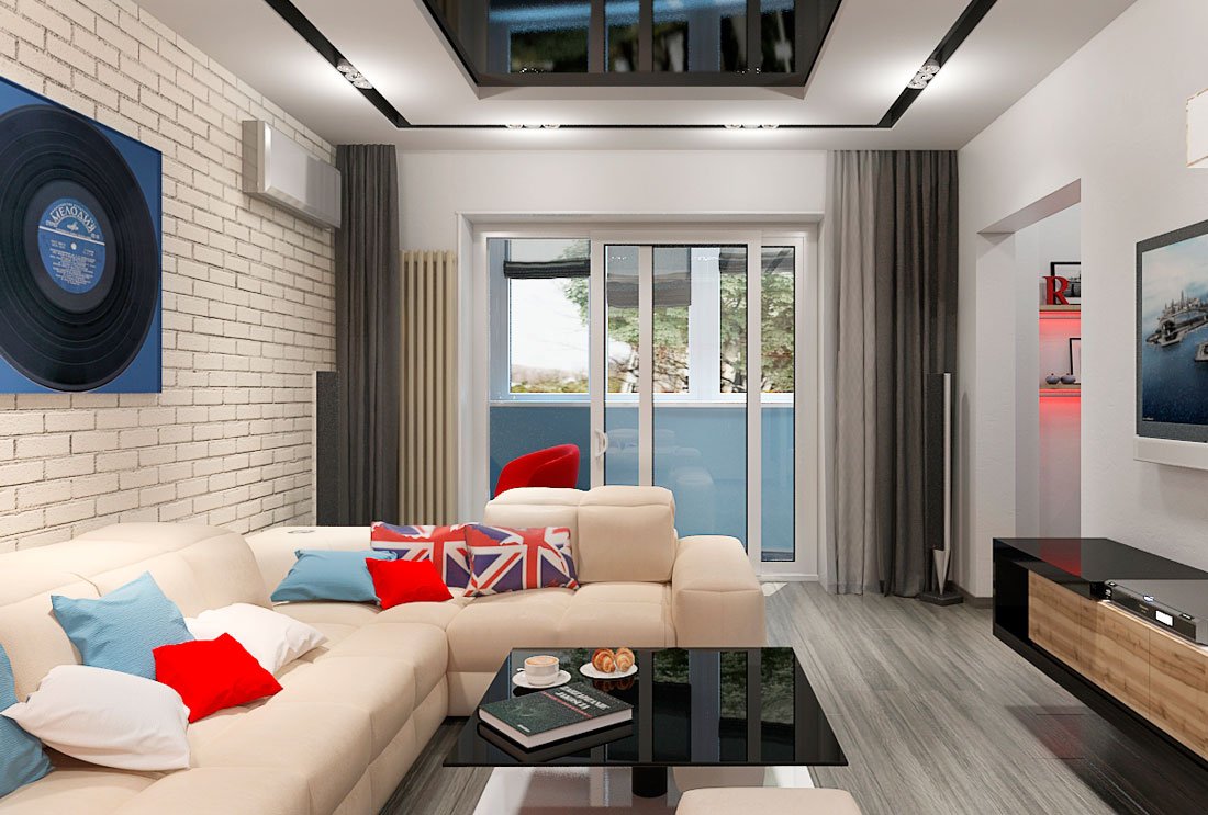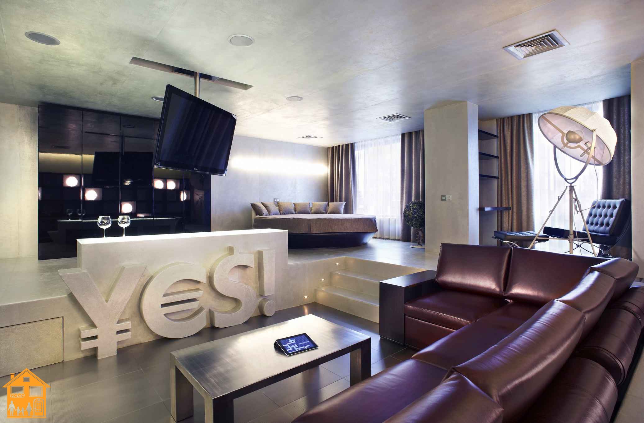 A diferencia de un loft, en comunicaciones de alta tecnología se disfraza detrás de cajas con una superficie metalizada. Las ventanas están cerradas con cortinas lisas al piso. Cerca del sofá debajo de la mesa de café hay una alfombra cuadrada con una pila corta (también sin dibujos).