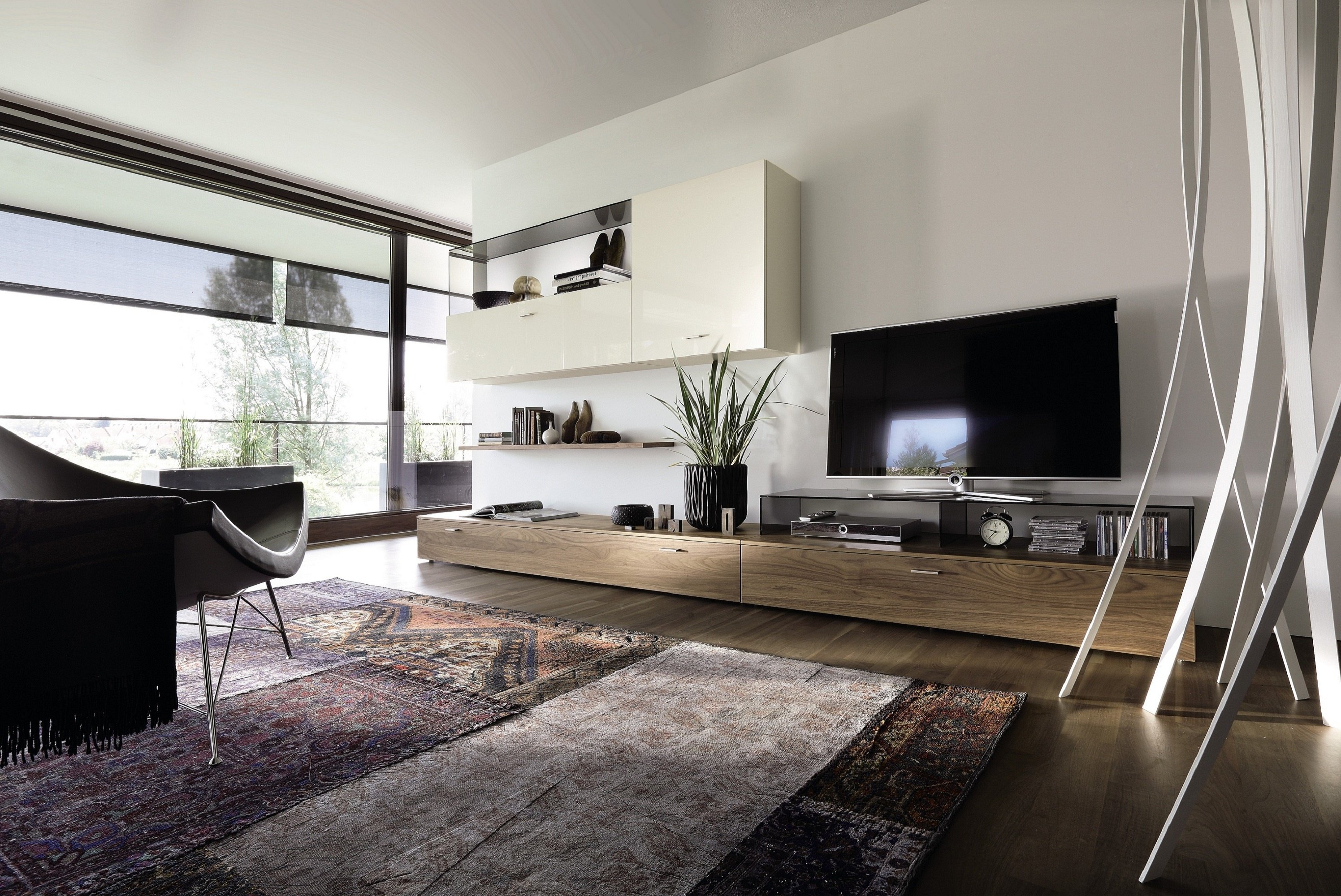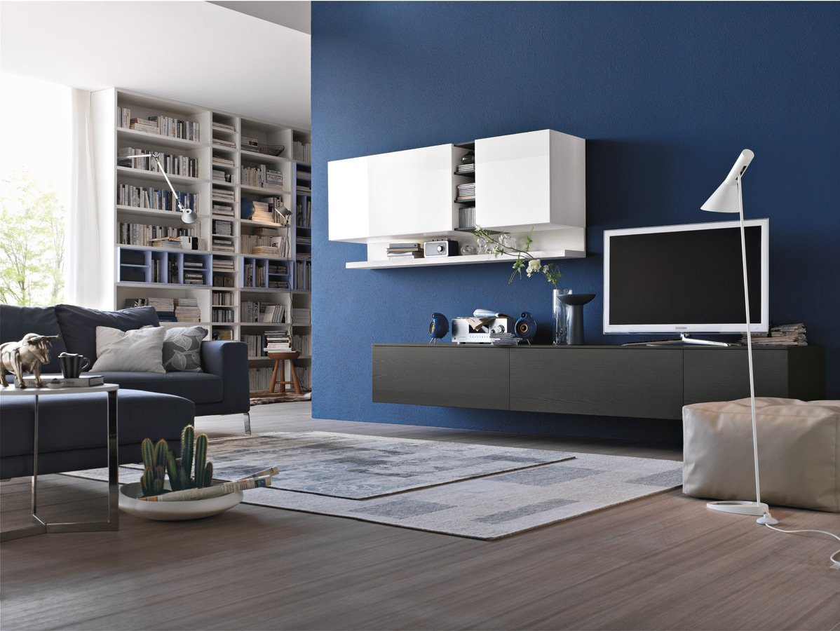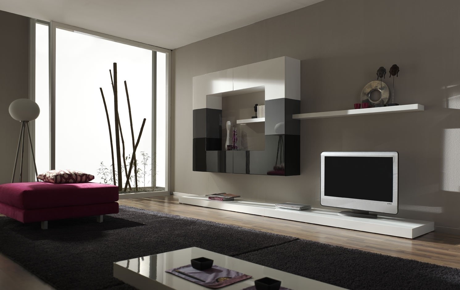 El televisor está montado directamente en la pared. Si necesita organizar lugares para almacenar cosas, entonces los estantes comunes con alta tecnología no caben. Elija gabinetes simples de formas rectangulares y cuadradas con fachadas brillantes que cuelgan de manera caótica en las paredes. Debajo de la composición se complementa con un gabinete bajo y alargado. Si necesita colocar una biblioteca en la sala, la elección de los lugares para almacenar libros también debe abordarse de manera creativa.Para estantes con bisagras de alta tecnología hechos de vidrio o metal, que están encerrados en una caja redonda, colgados en forma de escalones que conducen al techo, se ensamblan en una imagen compleja de "píxeles".