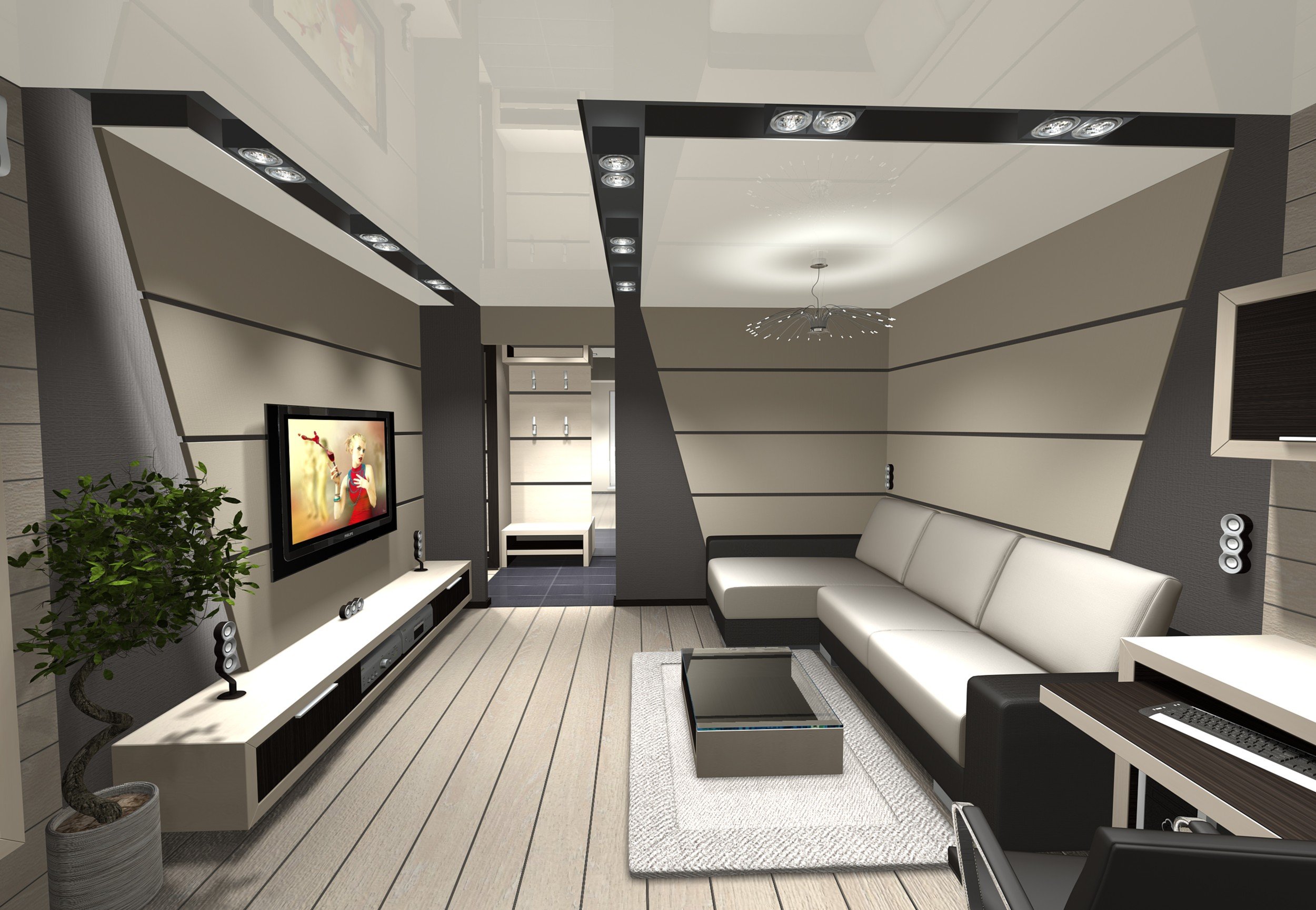 Para decorar el piso, elija baldosas de parquet, laminado, cerámica o vinilo y, con mucha menos frecuencia, piedra. La última opción es más adecuada para un baño o cocina. El piso a granel, que en la fortaleza puede discutir con el hormigón, también es popular. Lo principal es que el piso es monofónico, sin patrones. De las flores, se da preferencia a los tonos de marrón (madera) o una trinidad intransigente: blanco, negro, gris. El grupo principal de muebles, un sofá y una mesa, se puede colocar en el podio. Una luz de fondo está integrada en su umbral.