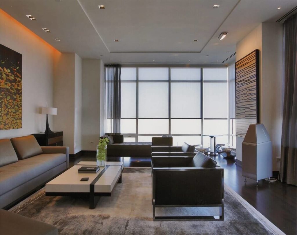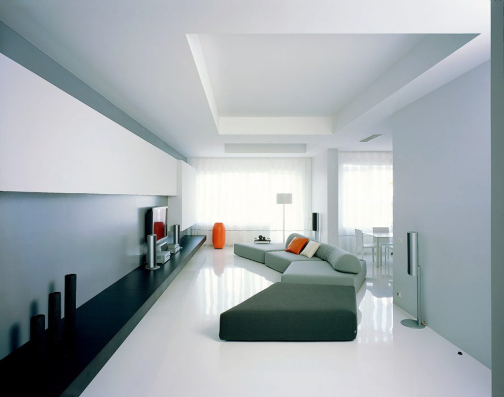 El mobiliario utilizado no es demasiado macizo, sino angular. Solo geometría simple en las mejores tradiciones del minimalismo. El mobiliario de la habitación es pobre, ya que el estilo gravita hacia espacios libres. A menudo, los modelos suspendidos se agregan a la composición.
