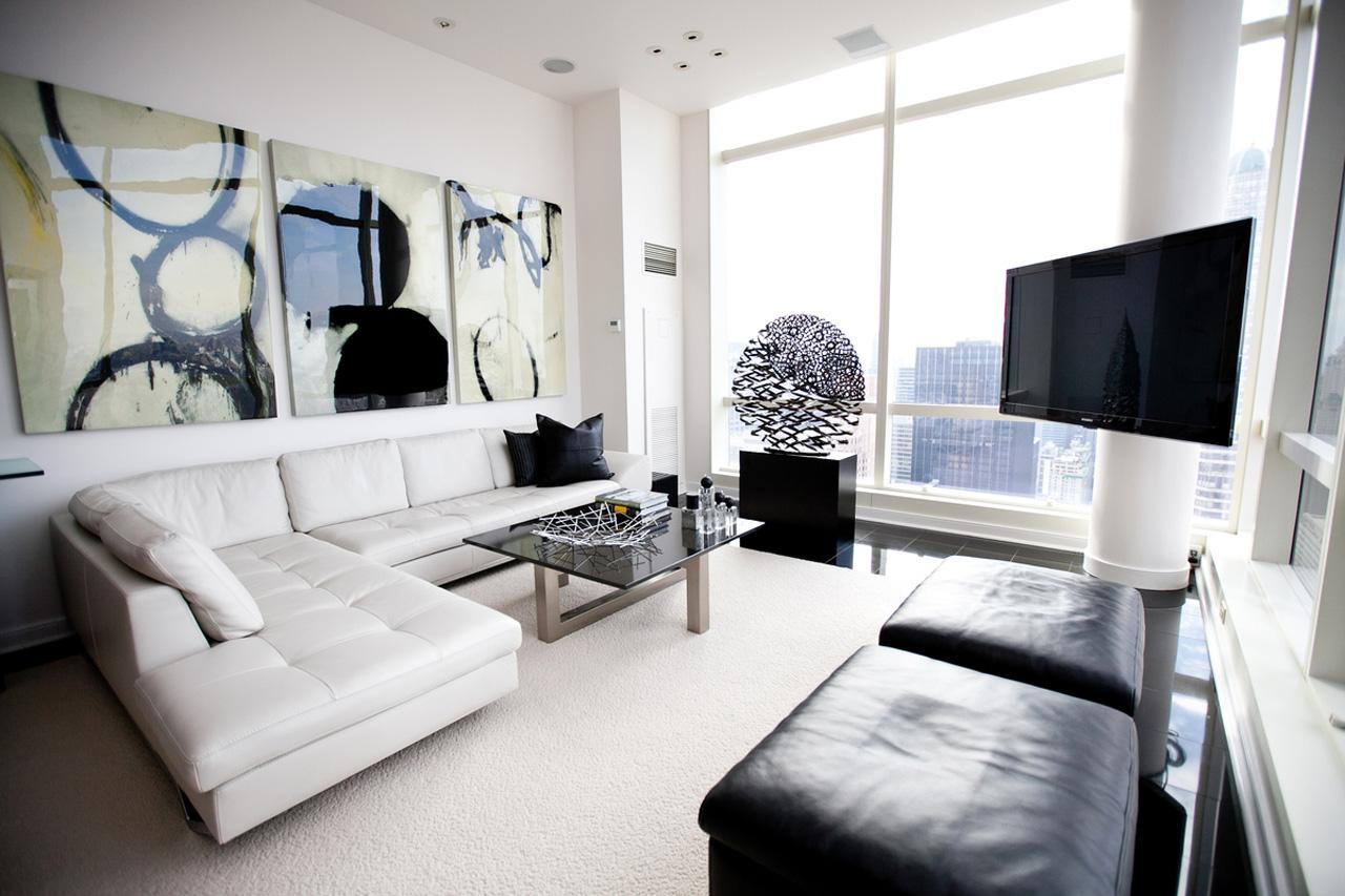 La decoración de la sala de estar utiliza un mínimo. En la pared puede colgar una imagen modular o un grupo de paneles, bajorrelieves futuristas, relojes "fluidos", como en los lienzos de Salvador Dalí. Por cierto, los detalles surrealistas y abstractos no solo complementan el interior, sino que también muestran a los huéspedes que los propietarios de la casa aprecian el alto arte. El sofá está decorado con varias almohadas. Sólido alterno con acento.Se coloca una lámpara elegante en una pierna alta y curva directamente sobre el sofá o sillón para que la lectura sea cómoda. En alta tecnología, puede agregar notas de estilo ecológico, obtendrá un interior ligeramente ecléctico. Por ejemplo, un “árbol” de vidrio o plástico en una tina en el piso o recipientes rectangulares largos en lugar de macetas comunes con brotes de avena reemplazarán las plantas de interior, pero al mismo tiempo revivirán la situación.