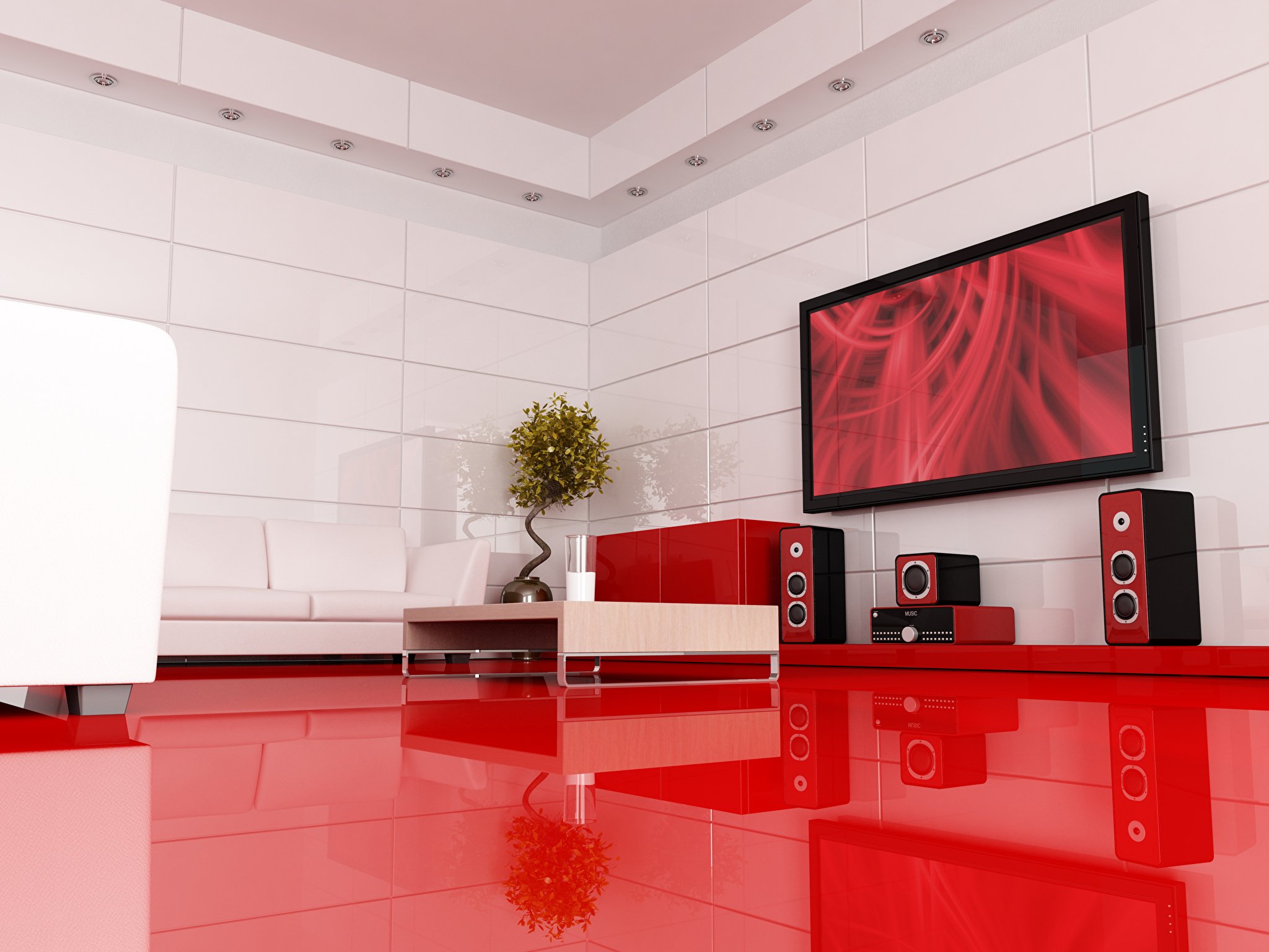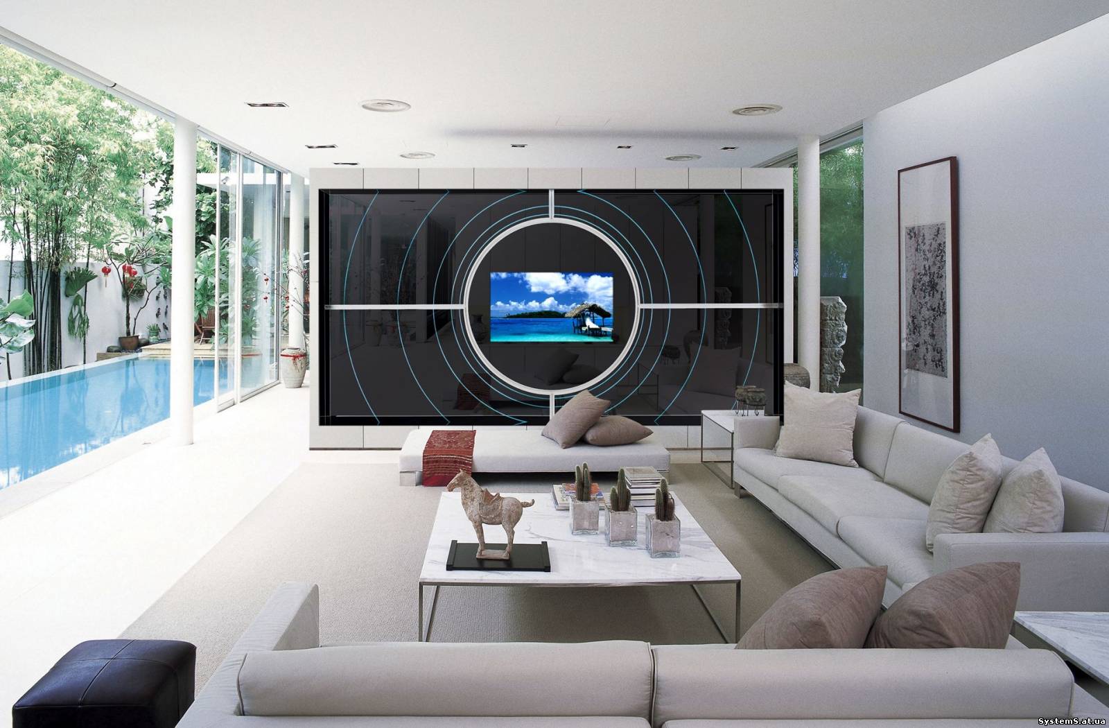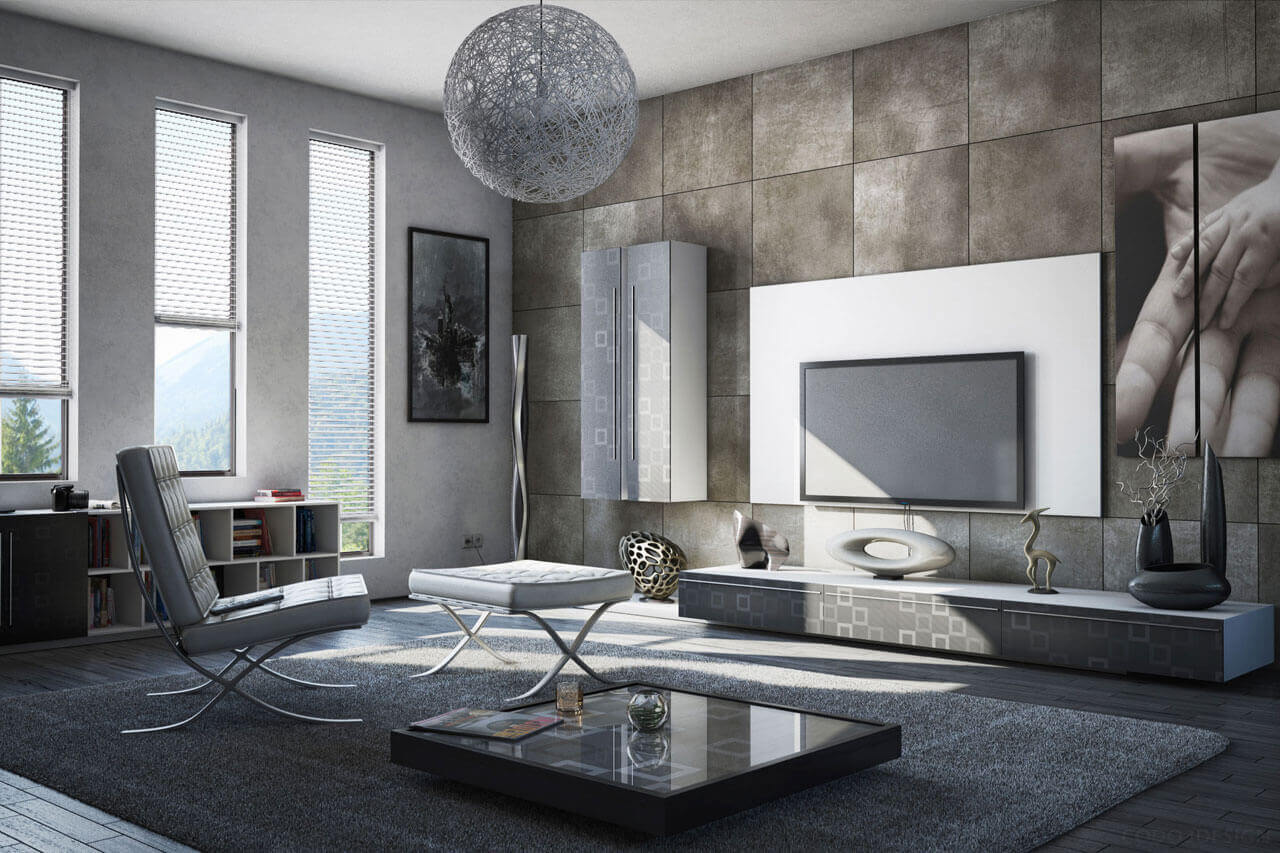 Las paredes de la sala de estar de alta tecnología están cubiertas con yeso texturizado o liso, pintura mate, papel tapiz, revestido con paneles de acrílico o PVC.Esta dirección se caracteriza por una combinación de diferentes colores y texturas. Una pared de acento seguramente se asigna en la habitación, que está pegada con papel tapiz fotográfico, pintada, decorada con decoración en forma de paneles, pinturas, composiciones inusuales. Por cierto, estos últimos incluyen "bolas de mercurio". Este elemento se usa a menudo en el futurismo, pero también es adecuado para alta tecnología. La decoración consiste en un grupo de bolas de acero aerodinámicas. Se fijan en paredes, techos (como una adición a las fuentes de luz). Algunos diseñadores van más allá y decoran toda el área de acento con fondos de pantalla en 3D que simulan muchas bolas, como en un sombrero de espuma. Tal movimiento le permite suavizar la angularidad de los muebles y la gravedad general de la situación. En la sala de estar, la pared de acento, como regla, se convierte en la que se encuentra la TV o el cine en casa, que se adapta mejor al estilo de alta tecnología.
