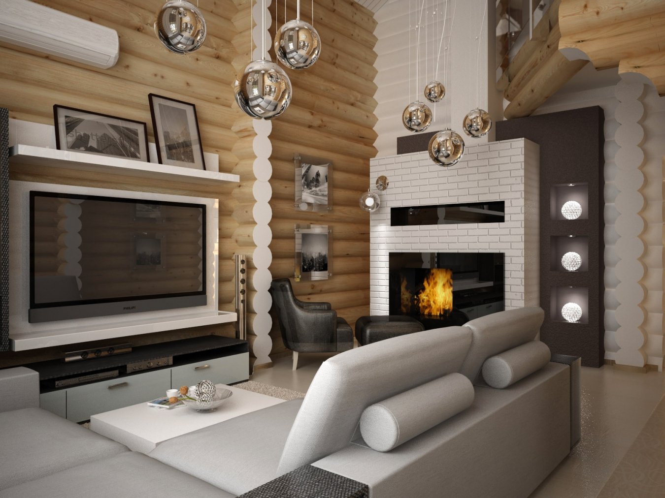 Una de las ideas de diseño originales es el elemento "ruso" en alta tecnología: los troncos de abedules reales. "Crecen" desde un nicho estrecho y largo contra la pared detrás del sofá. "Birch" descansa contra el techo, donde los focos se encuentran en un bulto estrellado.