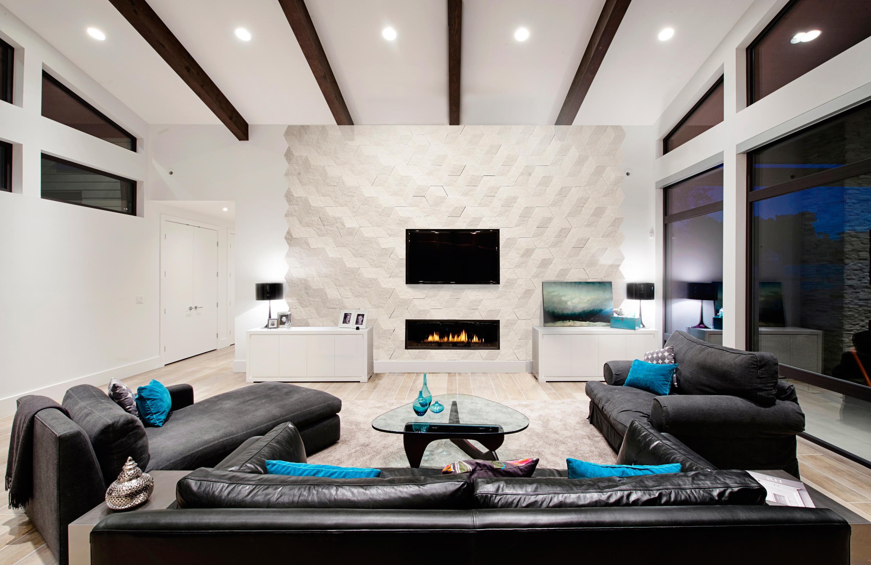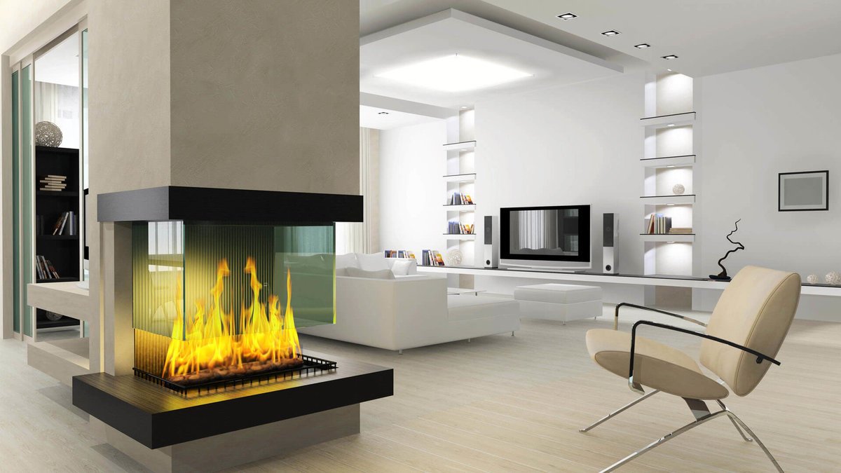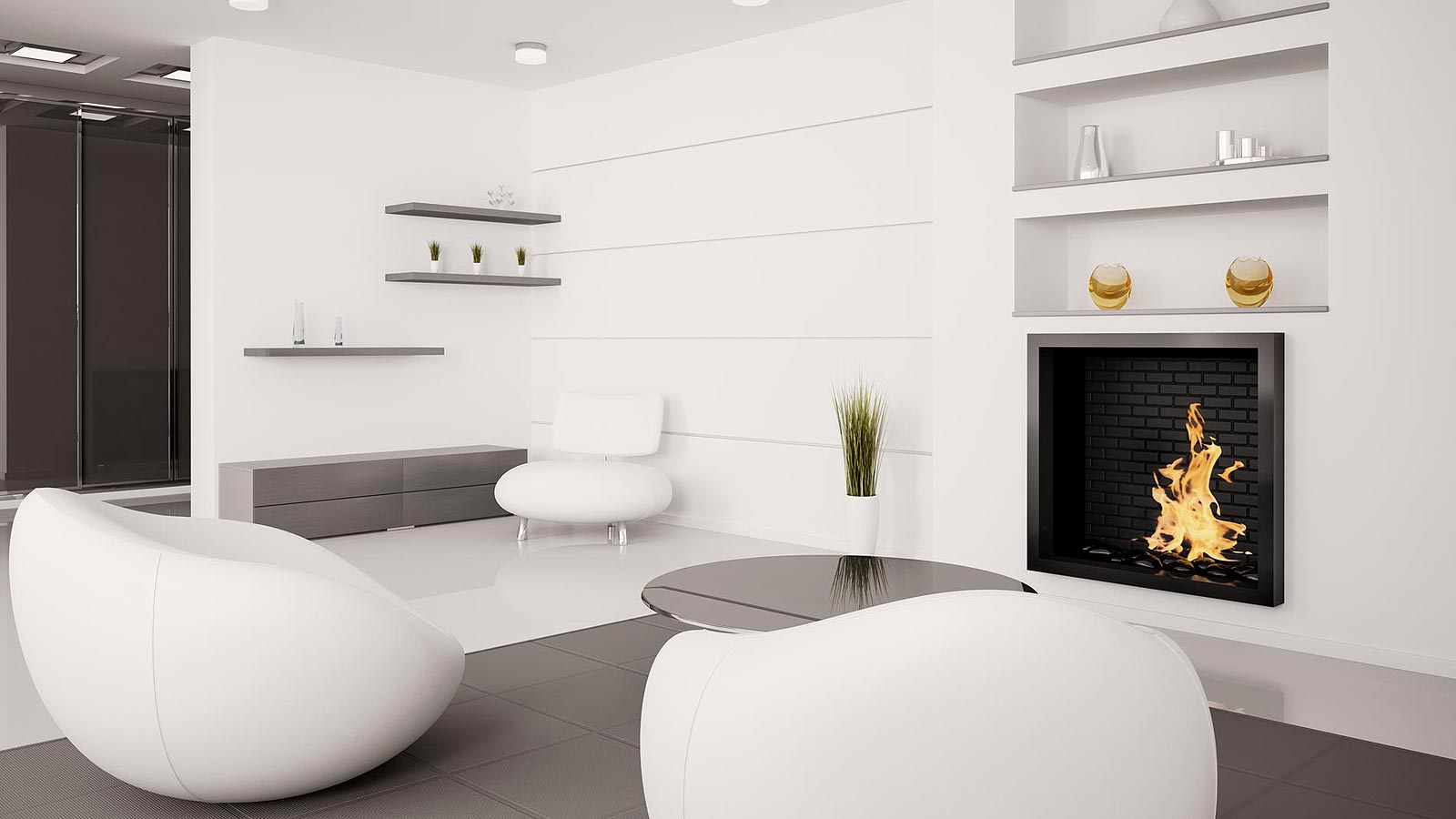 Las salas de estar tradicionales a menudo tienen chimeneas. Este elemento se considera un detalle clásico, sin el cual ni una sola sala podría prescindir en el pasado. En apartamentos pequeños, la chimenea voluminosa se reemplaza por un biomodelo moderno y compacto. Las opciones integradas se verán elegantes, donde la unidad está hecha de metal y la puerta protectora está hecha de vidrio templado. Se eligen muebles ergonómicos y lacónicos para la sala de estar. Un sofá rectangular o semicircular, una mesita baja, un par de sillones creativos o un sofá, una cara, una fiesta son suficientes. Tapicería elegir cuero. El material costoso enfatizará la elegancia de un entorno moderno.