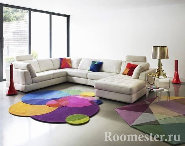 El piso y el techo no son componentes menos importantes del diseño que las paredes y los muebles. Consideremos con más detalle las ideas para su uso en la decoración del interior de la sala de estar en colores brillantes. Se pueden usar los siguientes materiales para el piso: