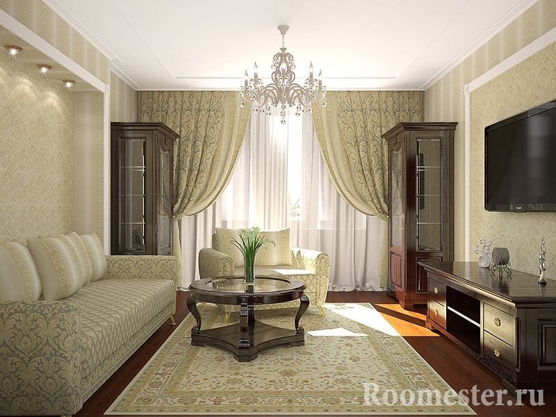 Si no eres fanático de la monotonía en el interior, no dudes en elegir impresiones en color, lo principal es que no son coloridas, con un patrón pequeño. Para la sala de estar 16 sq. No se recomienda iluminar las paredes y el techo, tal solución puede conducir a una reducción visual de la sala de estar. Es mejor hacer un énfasis contrastante con accesorios extraíbles como manteles, cortinas, jarrones. Es importante elegir no más de 3 colores para diluir el interior, de lo contrario se verá demasiado pretencioso.
