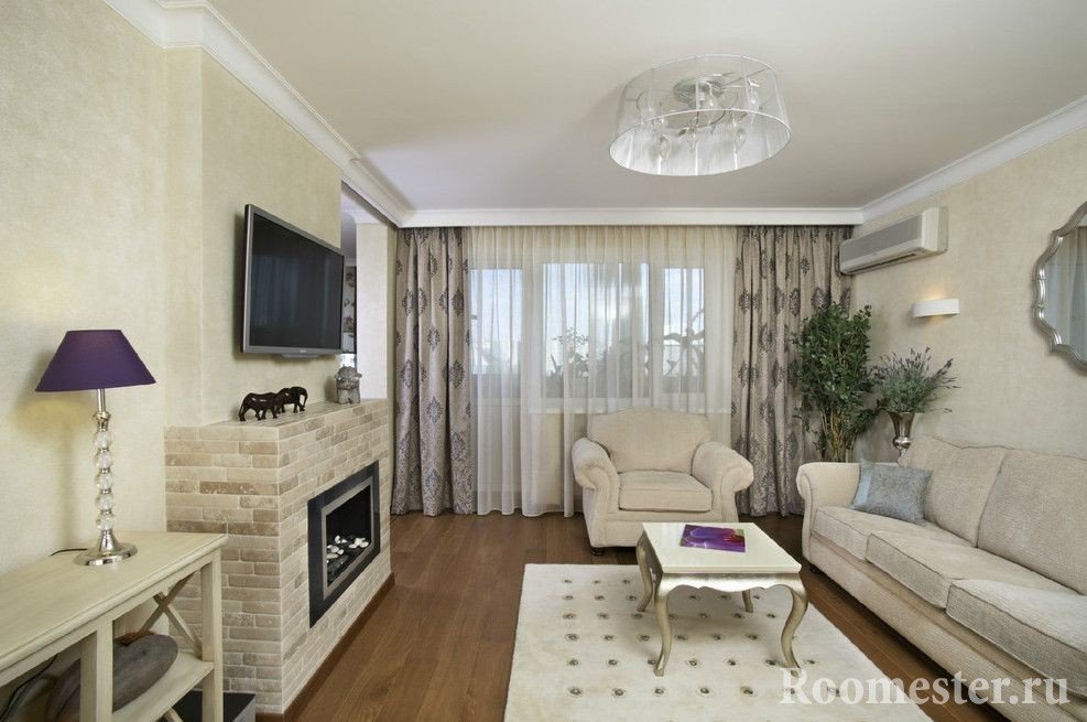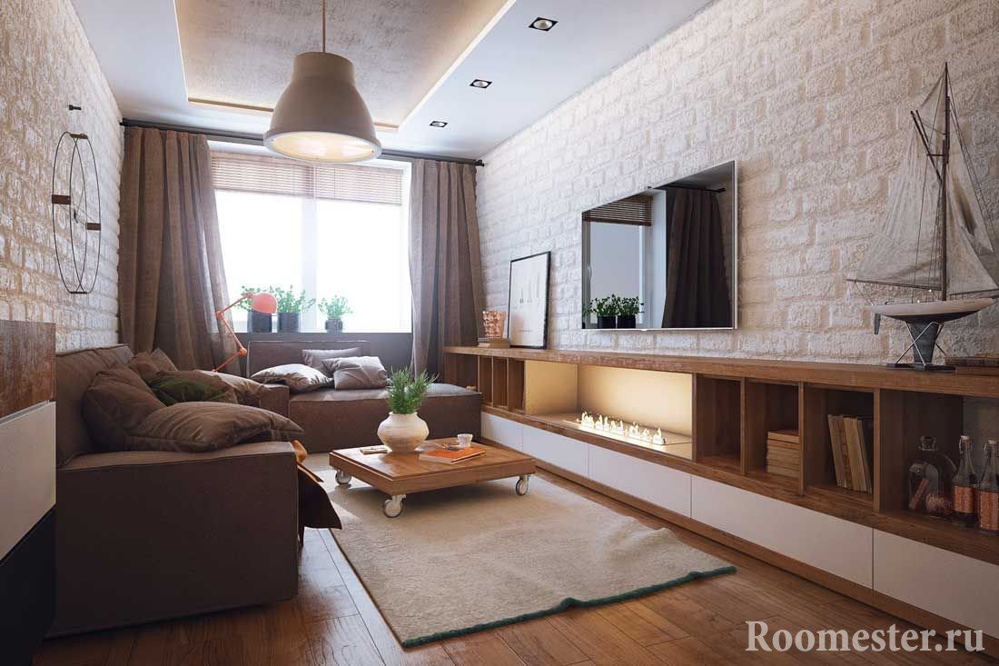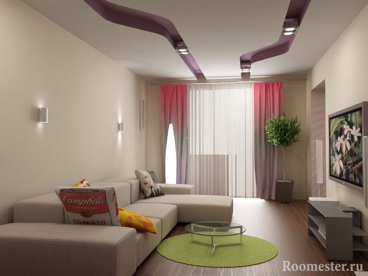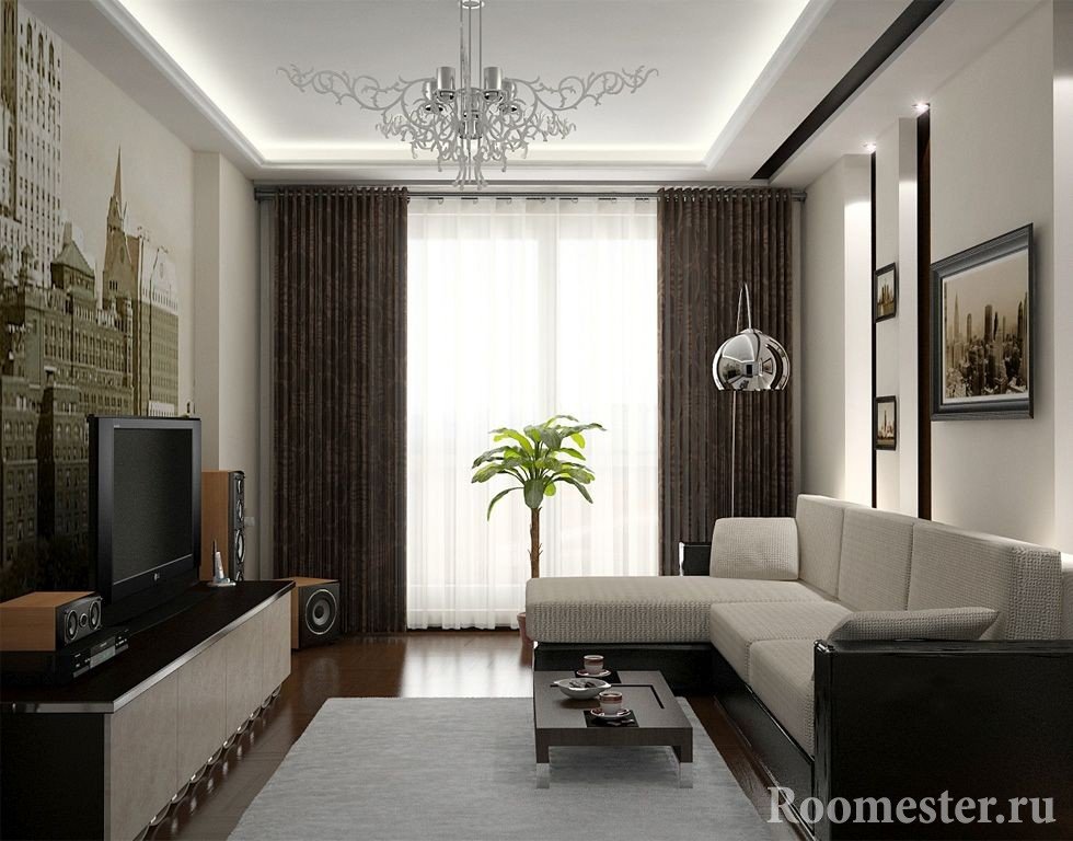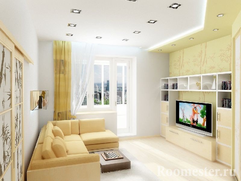 La parte central del apartamento será completamente gratis si coloca un sofá de esquina en la esquina más alejada de la entrada. En la pared opuesta, puedes colgar un televisor y poner un pequeño armario, chimenea, mesa.