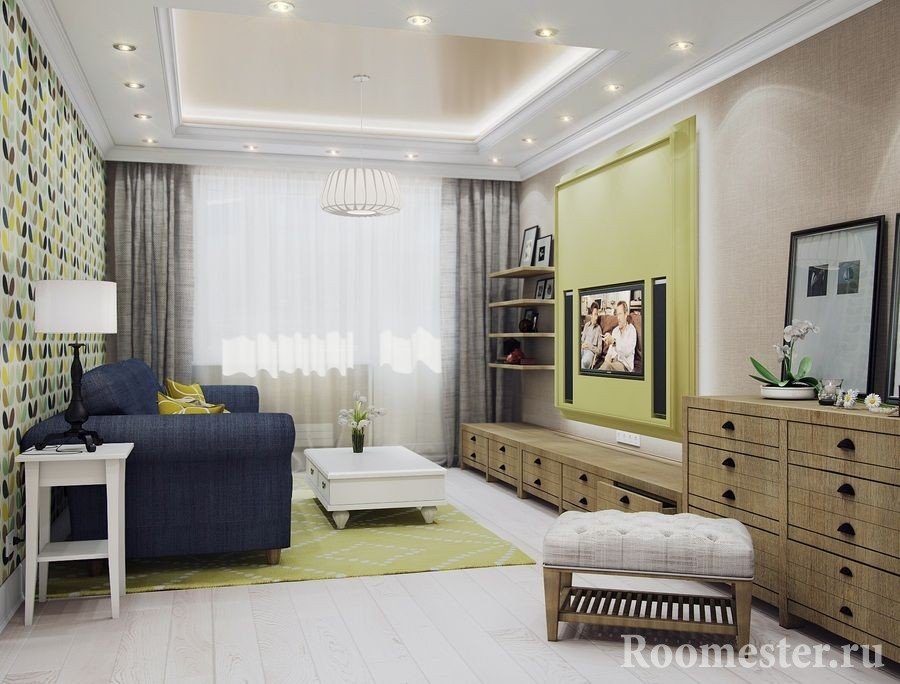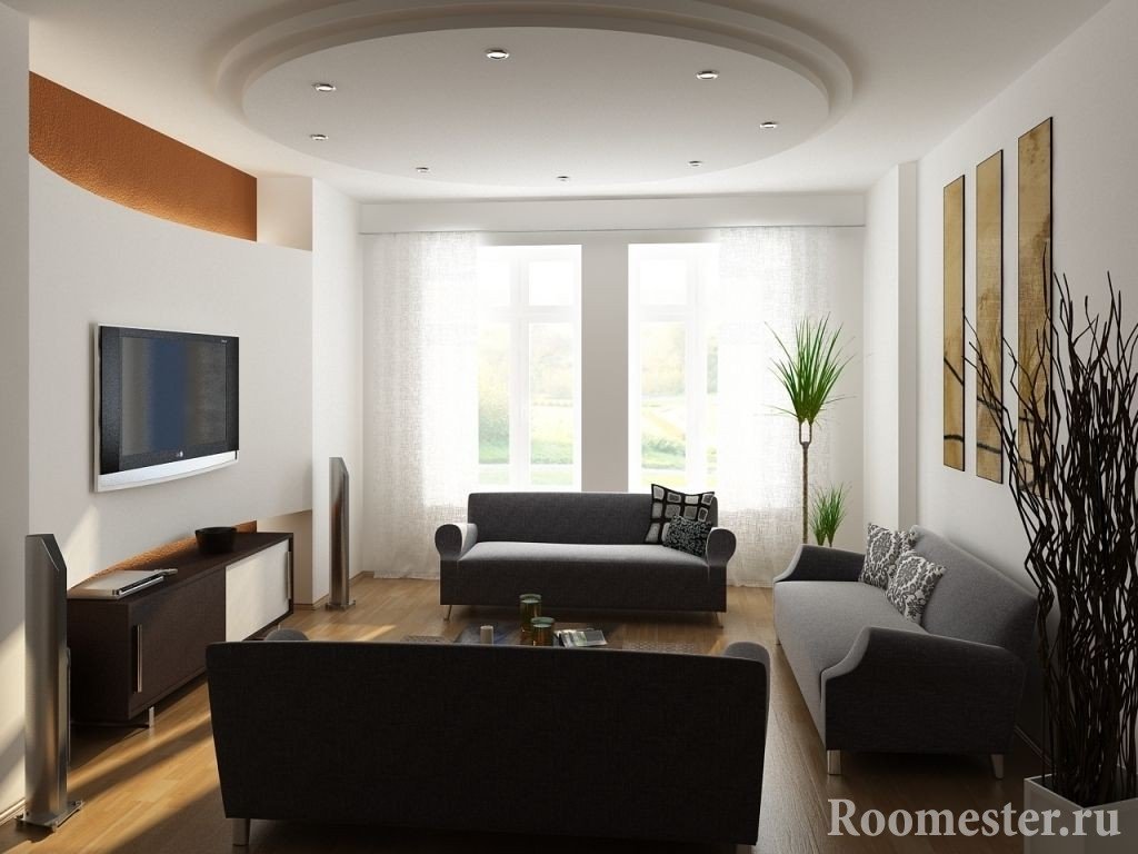 Diseño para el techo en los apartamentos, donde la sala de estar es de 16 metros cuadrados. m debe ser lo más simple posible, sin construcciones complejas de paneles de yeso de varios niveles. Es importante utilizar un esquema de color claro, idealmente blanco como la nieve o un par de tonos más claros que las paredes.