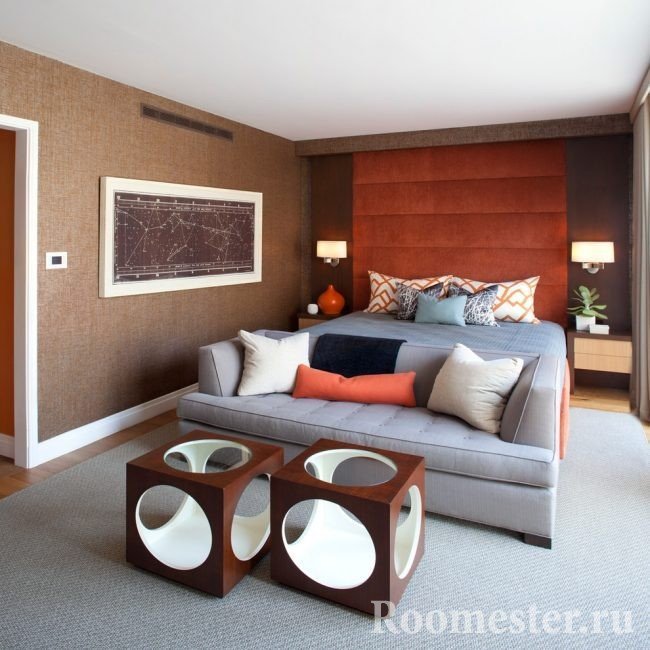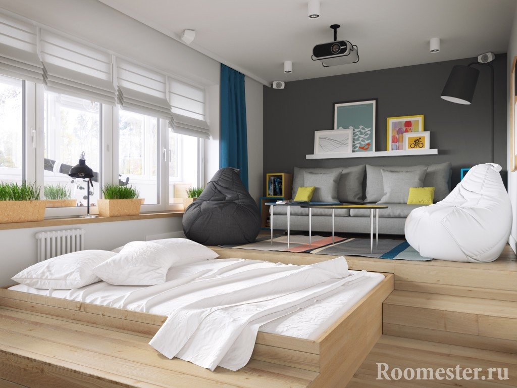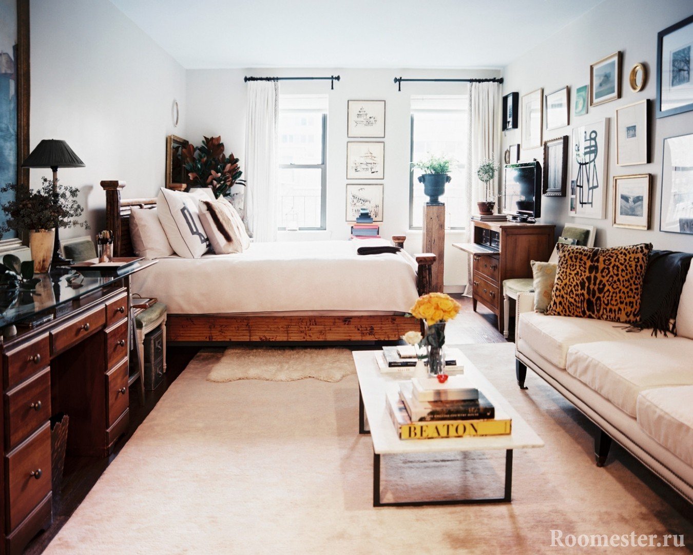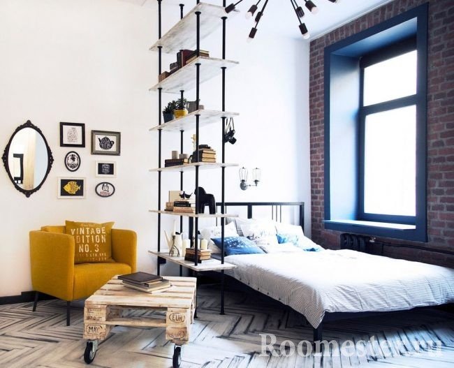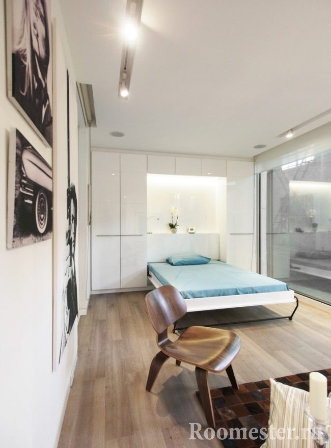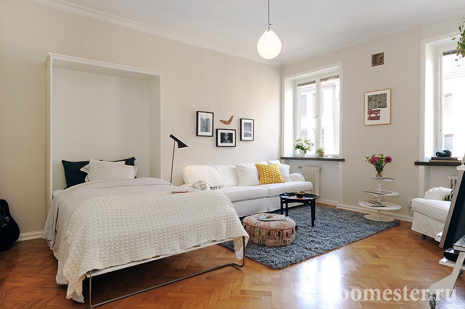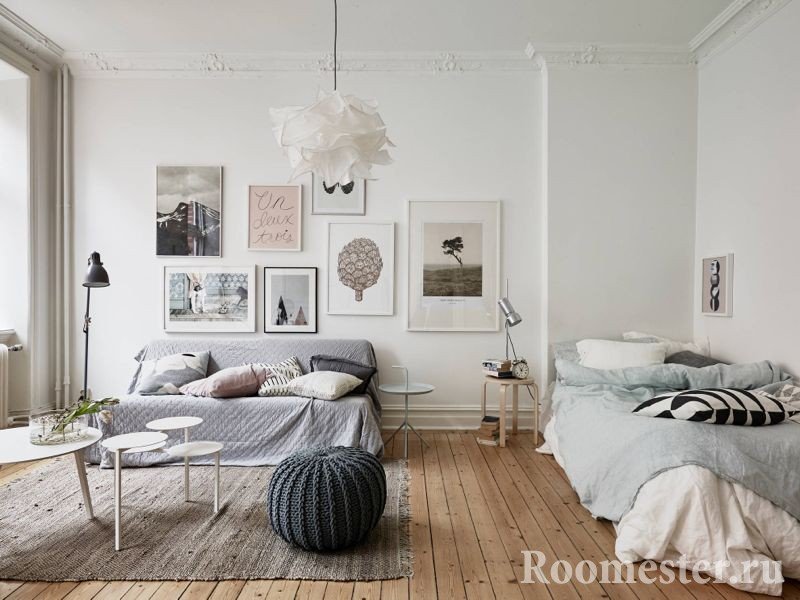 Encontrar un compromiso en la disposición de los muebles es una tarea más urgente que elegir un estilo. La ausencia de particiones no siempre es la mejor opción, aunque en este caso el volumen visual se conservará por completo. Un modelo de cama lacónica con textiles a juego en las paredes no se destacará.